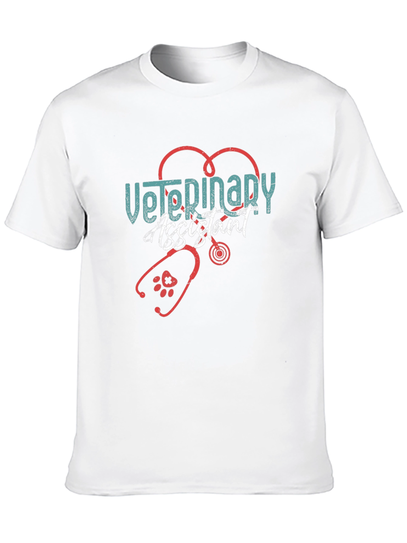 Muestra tu pasión por el cuidado animal con esta camiseta negra de asistente veterinario. El diseño presenta la palabra "Veterinary" en letras con textura azul verdoso, complementado con "Assistant" en un estilo manuscrito blanco. Un corazón rojo estilizado que simula un estetoscopio rodea las palabras, incorporando una huella de pata, lo que lo convierte en un diseño único y llamativo. Perfecta para usar en el trabajo, eventos veterinarios o simplemente para mostrar tu orgullo como asistente veterinario. Fabricada con materiales cómodos y duraderos, esta camiseta es ideal para el uso diario. Un regalo perfecto para cualquier asistente veterinario dedicado.
