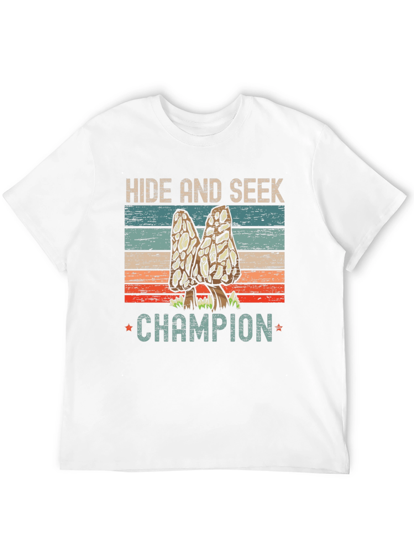 Esta llamativa camiseta negra presenta un diseño retro con la frase "HIDE AND SEEK CHAMPION" (campeón de las escondidas), adornada con ilustraciones detalladas de hongos morela. El diseño incorpora franjas de colores estilo vintage que le dan un toque nostálgico. Perfecta para los amantes de la naturaleza, buscadores de setas o para aquellos que disfrutan de un estilo único y llamativo. Ideal para uso diario, eventos casuales o como un regalo original para amigos y familiares. La camiseta parece ser de algodón, ofreciendo comodidad y durabilidad.