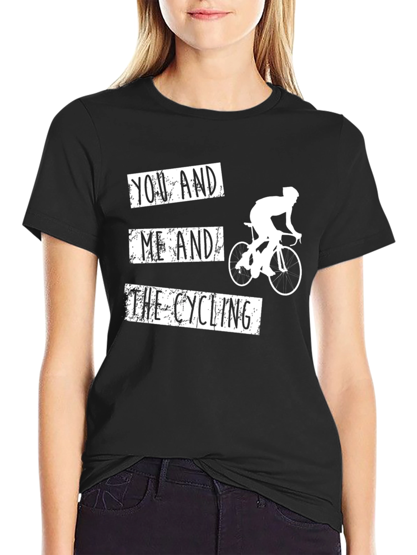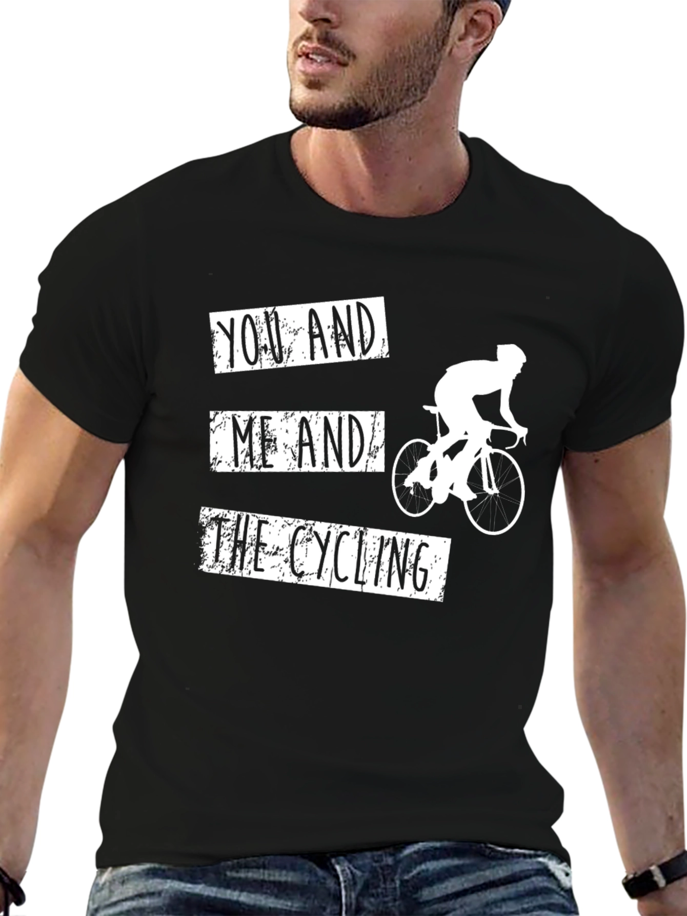 Muestra tu pasión por el ciclismo con esta elegante camiseta negra. Presenta un diseño llamativo con la frase "Tú y Yo y el Ciclismo" en letras blancas y estilo envejecido, acompañada de la silueta de un ciclista. Fabricada con materiales cómodos y de buena calidad, es perfecta para usar en tus salidas en bicicleta, en el gimnasio o simplemente para un look casual. Su diseño único te hará destacar entre los amantes del ciclismo. Ideal para regalar a ese amigo o familiar que comparte tu afición por las dos ruedas. ¡Luce tu pasión con estilo!