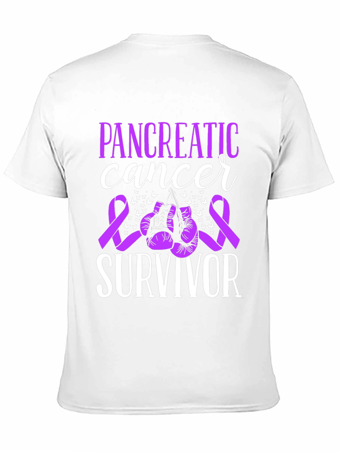 Luce esta camiseta negra de manga corta que celebra la valentía de los sobrevivientes del cáncer de páncreas. Presenta un diseño impactante con las palabras "PANCREATIC cancer SURVIVOR" en llamativos colores morado y blanco. El lazo púrpura, símbolo de la lucha contra esta enfermedad, se entrelaza con un guante de boxeo, representando la fuerza y la determinación de quienes lo han superado. Ideal para crear conciencia y mostrar tu apoyo a esta noble causa. Perfecta para eventos benéficos, marchas de concienciación o para llevar con orgullo en el día a día, esta camiseta es una declaración de esperanza y resiliencia.