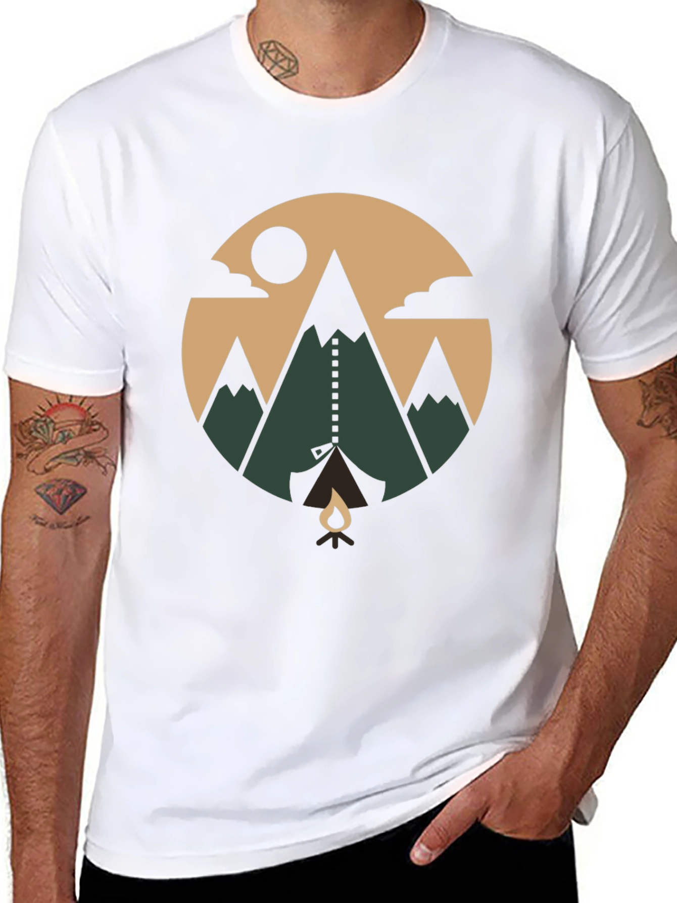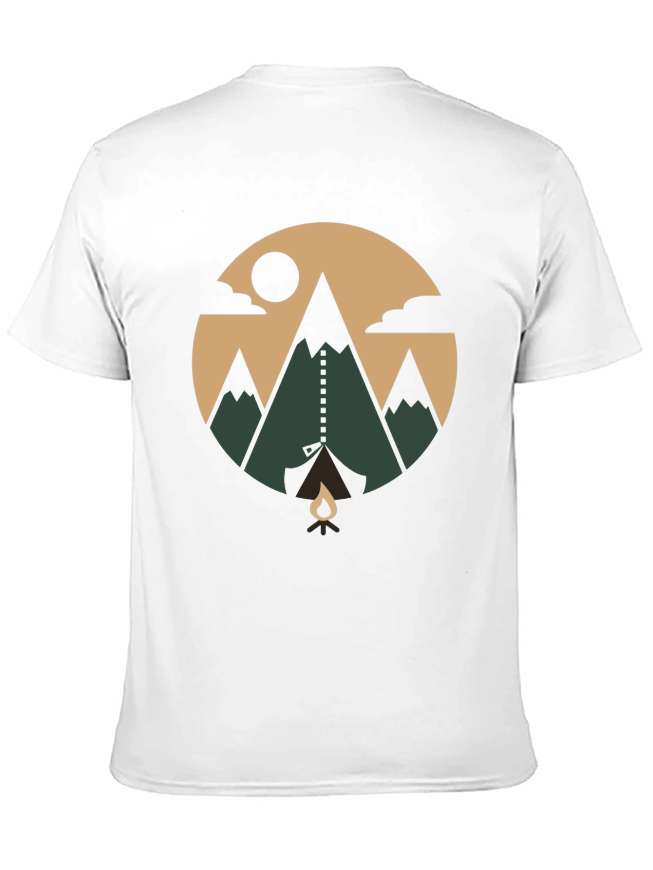 Esta camiseta negra de manga corta presenta un diseño circular llamativo con temática de aventura al aire libre. El estampado muestra un paisaje montañoso estilizado con tonos tierra y verdes, nubes, un sol y una fogata, evocando la naturaleza y la exploración. Hecha de un material suave y cómodo, esta camiseta es ideal para el uso diario o para actividades al aire libre. Perfecta para los amantes de la naturaleza y los entusiastas del camping, esta camiseta combina estilo y pasión por la aventura. Añade un toque único a tu guardarropa con esta prenda original y atractiva. ¡Lleva contigo el espíritu de la montaña a donde vayas!