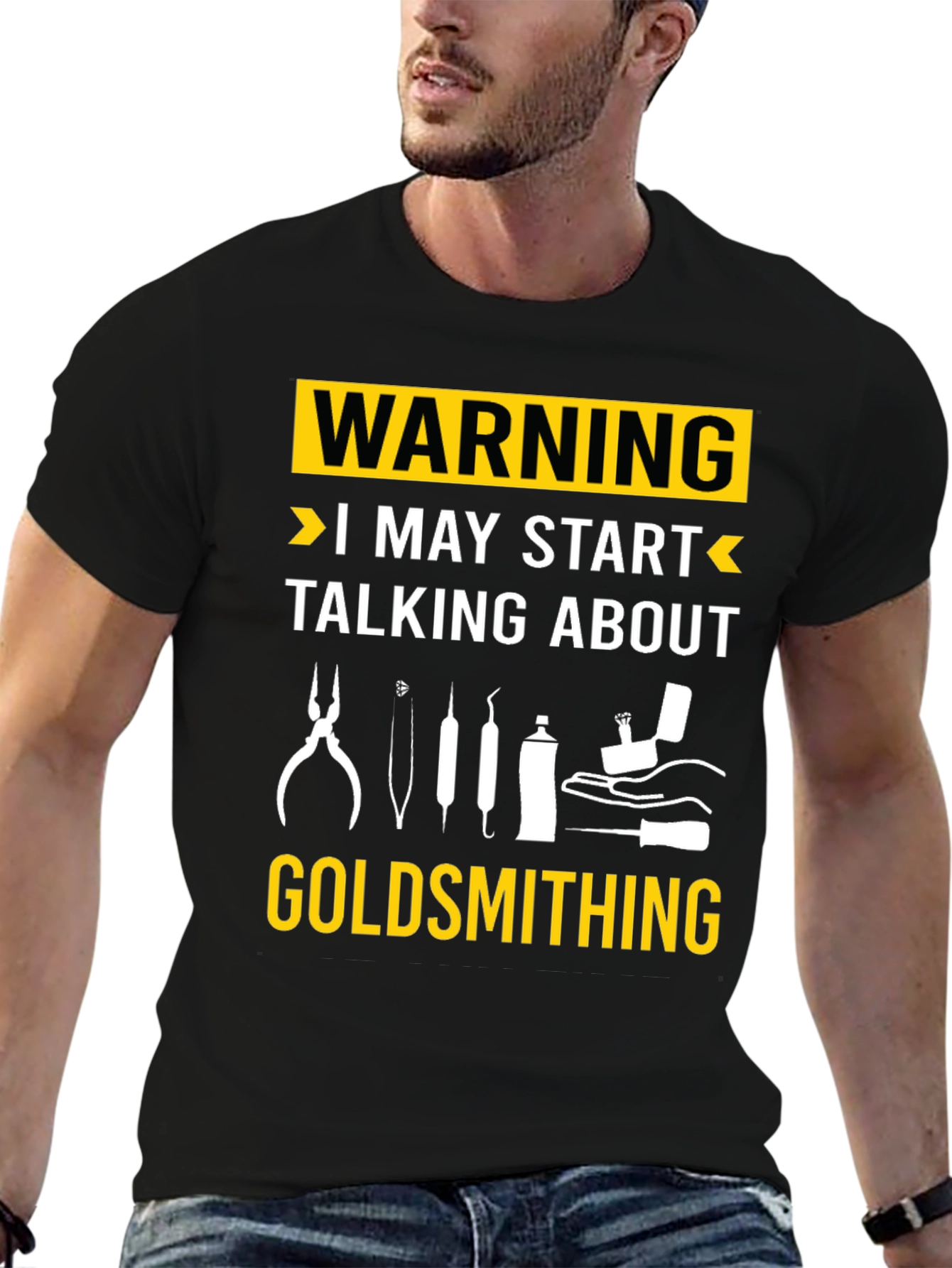 Muestra tu pasión por la orfebrería con esta camiseta negra de diseño único. Con un llamativo texto en amarillo y blanco que advierte: "¡Cuidado! Podría empezar a hablar de orfebrería", esta prenda es perfecta para orfebres y entusiastas de la joyería. El diseño incluye ilustraciones detalladas de herramientas de orfebrería clásicas. Fabricada con materiales suaves y cómodos, esta camiseta es ideal para uso diario, ya sea en el taller o en salidas casuales. ¡Una declaración divertida y original para cualquier amante de la creación de joyas!