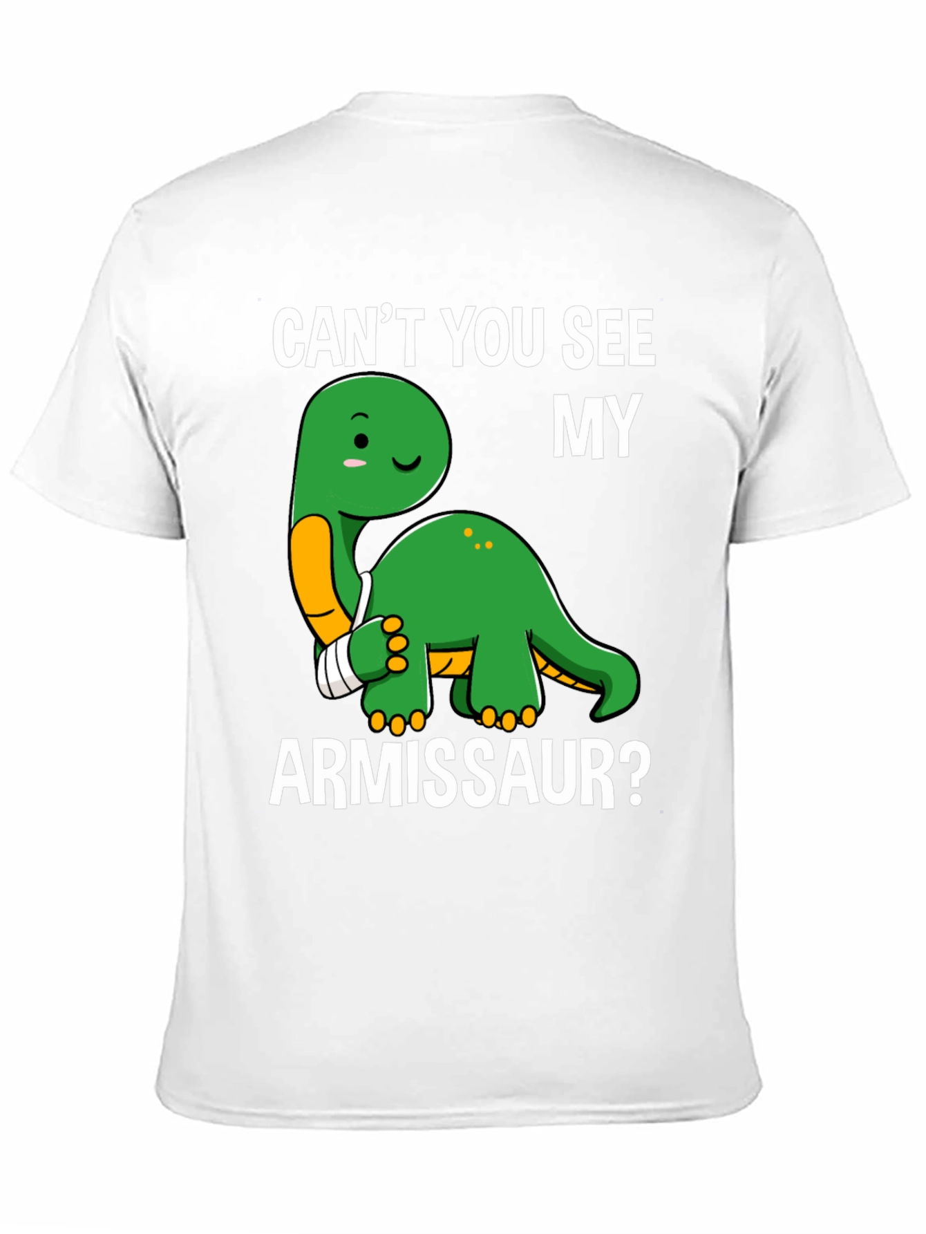 ¡Muestra tu sentido del humor con esta camiseta negra de diseño único! Presenta un adorable dinosaurio de dibujos animados, un "Armisaurio" verde con un brazo vendado. La frase ingeniosa "¿No puedes ver mi Armisaurio?" está estampada en letras blancas llamativas. Perfecta para los amantes de los dinosaurios, los juegos de palabras y aquellos con un estilo divertido y original. Ideal para usar en salidas casuales, reuniones con amigos o simplemente para alegrar el día a cualquiera. Esta camiseta llamativa seguramente generará sonrisas y conversaciones. ¡Consigue la tuya hoy y deja que tu lado juguetón brille!