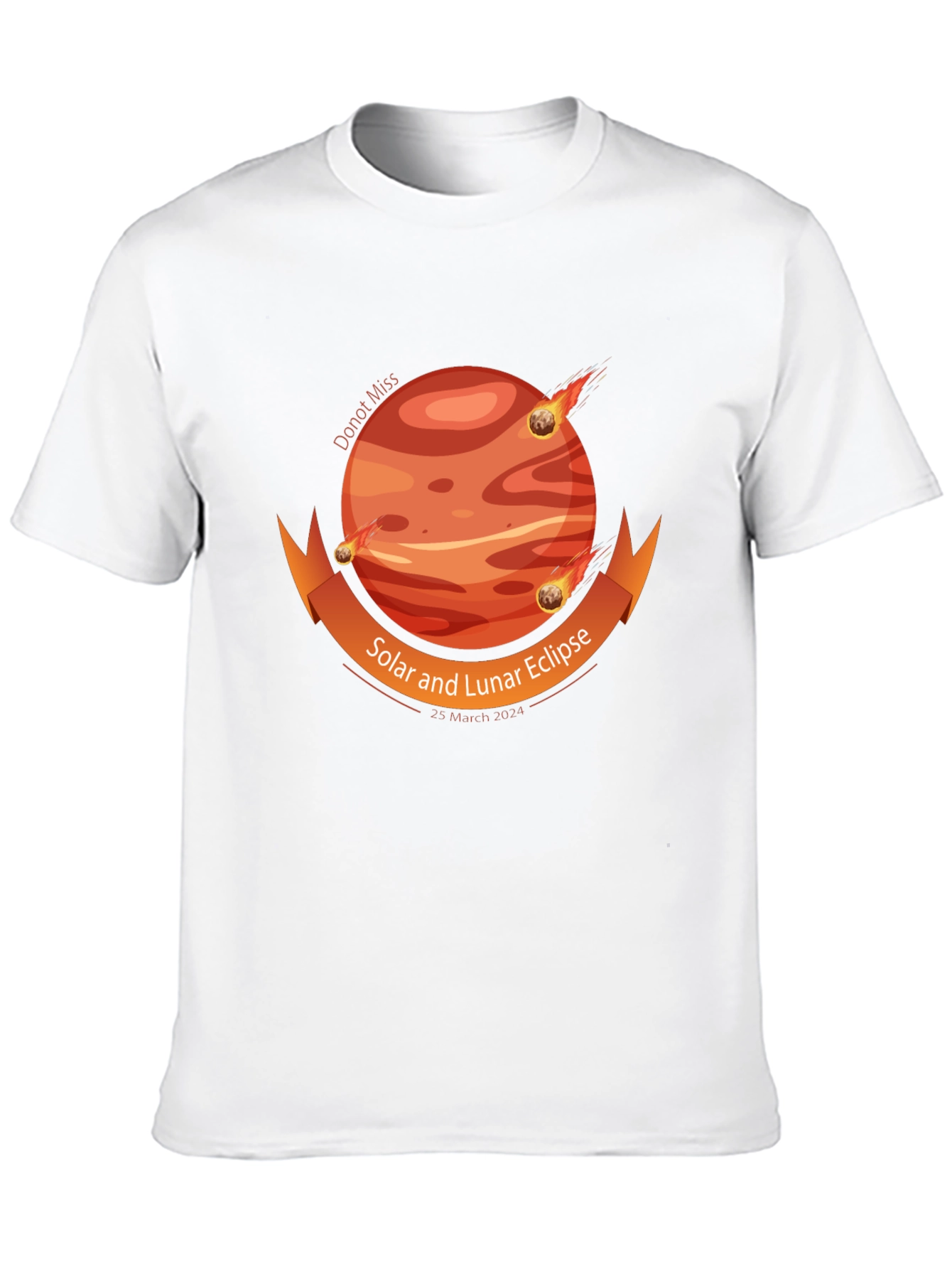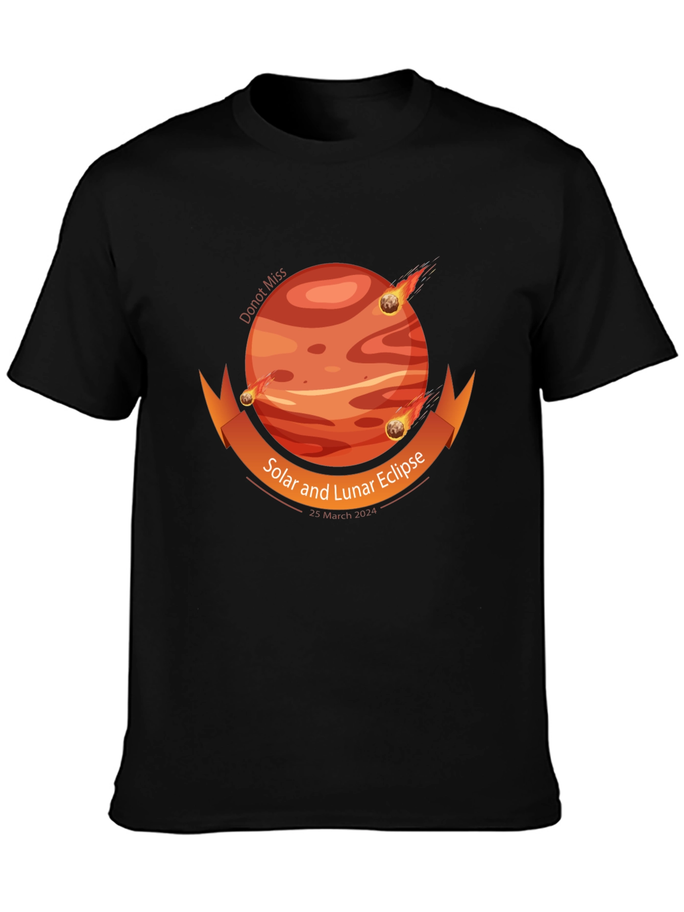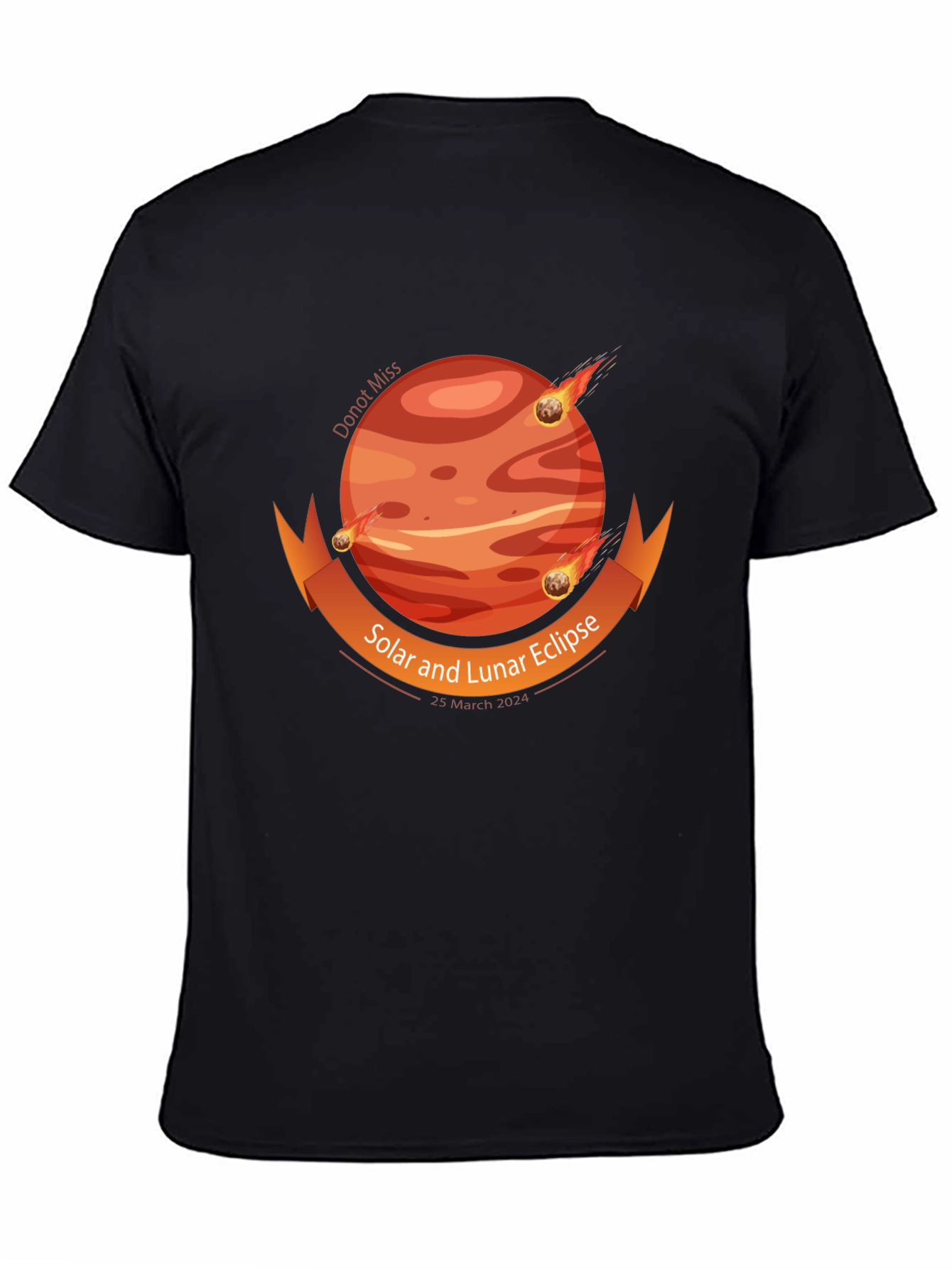 ¡Prepárate para el eclipse con esta camiseta única! Fabricada en un suave tejido negro, esta camiseta presenta un llamativo diseño de un planeta en tonos naranja y rojo, con meteoritos pasando alrededor. Una cinta naranja adorna el diseño, anunciando el "Eclipse Solar y Lunar, 25 de Marzo 2024". La camiseta es ideal para los entusiastas de la astronomía, eventos especiales o como un regalo original. Su diseño unisex y corte cómodo la hacen perfecta para cualquier ocasión casual. Muestra tu pasión por el cosmos con estilo y comodidad. ¡No te pierdas esta edición limitada!