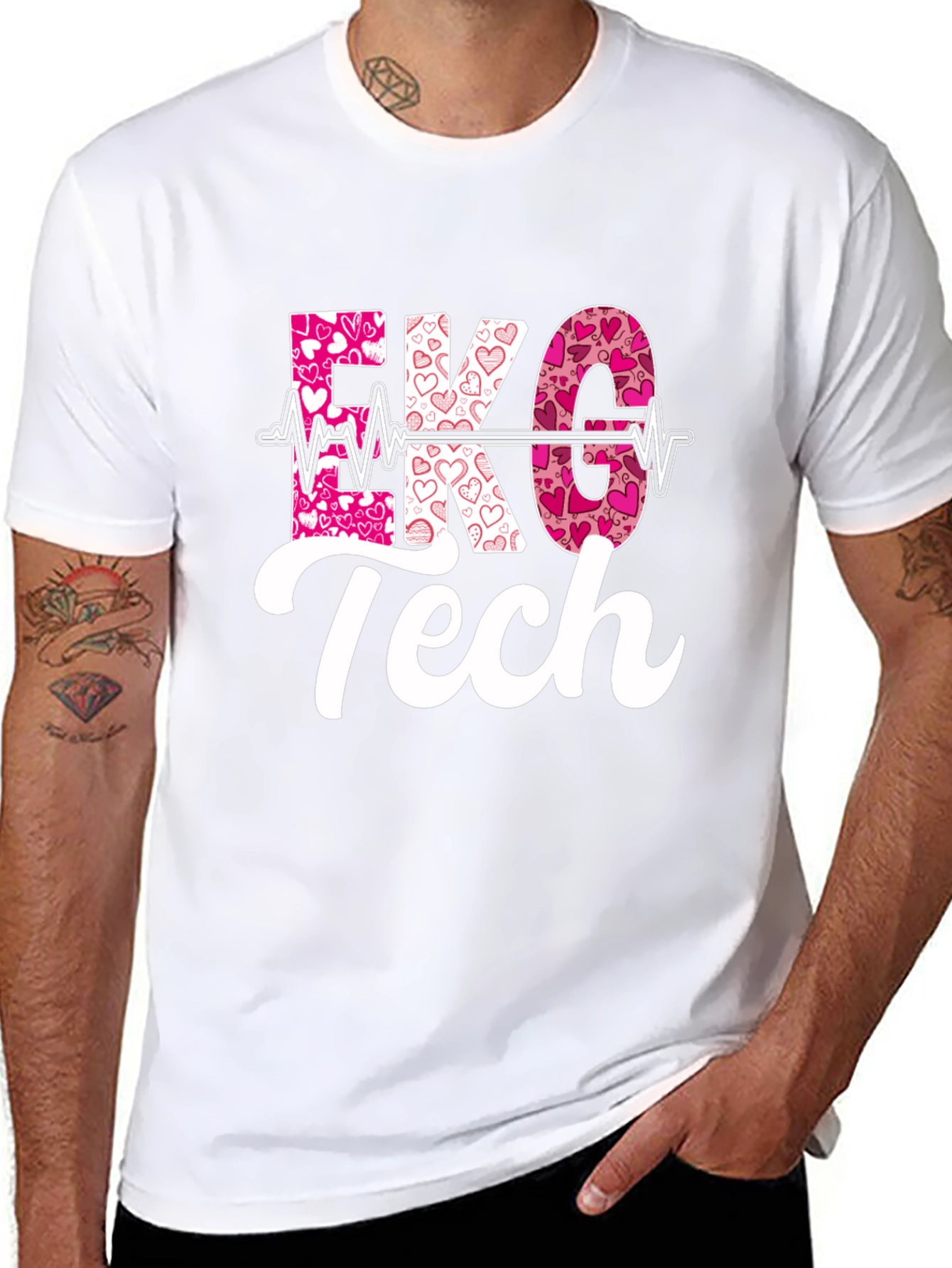 Celebra el amor y tu profesión con esta original camiseta negra de EKG Tech. El diseño llamativo presenta las letras 'EKG' rellenas con un patrón de corazones rosados y rojos, conectado por una línea de vida que simboliza el monitoreo cardíaco. Debajo, la palabra 'Tech' en blanco completa el mensaje con un estilo moderno y legible. Ideal para técnicos de electrocardiograma, enfermeras o cualquier profesional de la salud que quiera mostrar su pasión por el cuidado del corazón. Perfecta para usar en el trabajo, en celebraciones de San Valentín o como un regalo especial para ese alguien que salva vidas a diario. ¡Luce con orgullo tu dedicación con esta cómoda y estilosa camiseta!