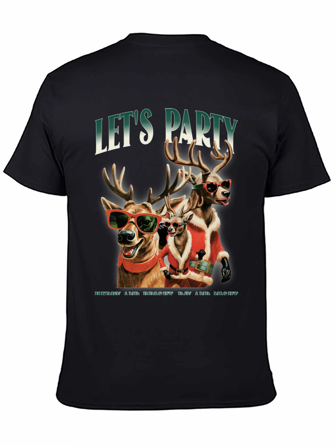 ¡Prepárate para las fiestas con esta divertida camiseta! Presenta un diseño único con ciervos animados llevando gafas de sol y trajes de Papá Noel, listos para la fiesta. La frase "Let's Party" destaca en la parte superior, añadiendo un toque de alegría y celebración. Debajo, se lee "Merry and Bright Day and Night", transmitiendo el espíritu navideño. Ideal para llevar en reuniones familiares, fiestas con amigos o simplemente para contagiar alegría en esta temporada. Fabricada en un material suave y cómodo, esta camiseta negra es perfecta para lucir un estilo festivo y original. ¡Haz que estas Navidades sean inolvidables con esta prenda única!
