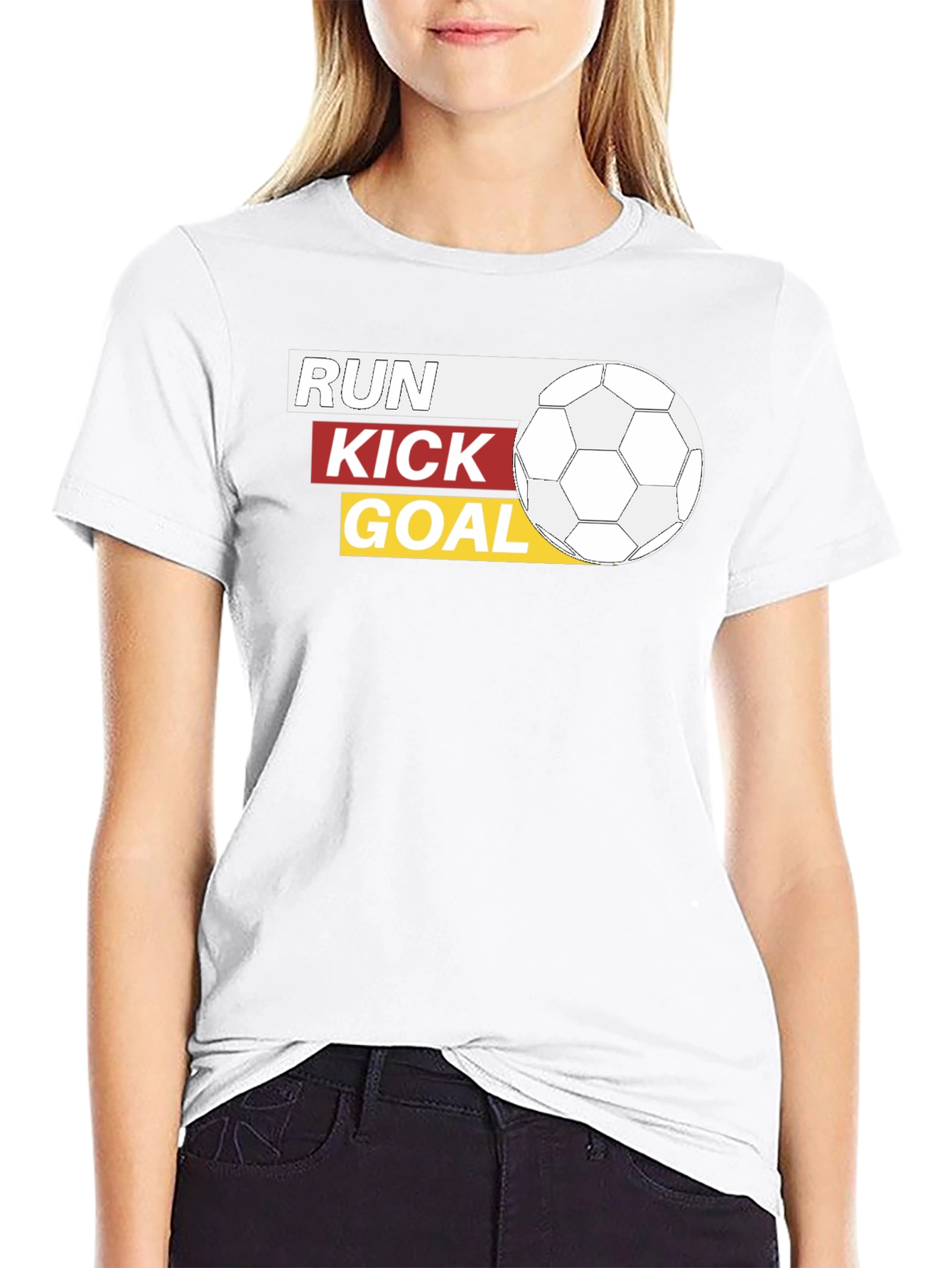 ¡Luce tu pasión por el fútbol con esta camiseta única! Presenta un diseño llamativo con las palabras "RUN", "KICK" y "GOAL" en bloques de color contrastantes, acompañadas de una ilustración de un balón de fútbol. Fabricada en tela negra, esta camiseta de manga corta ofrece comodidad y estilo para cualquier ocasión informal. Ideal para usar en partidos, entrenamientos o simplemente para mostrar tu amor por el deporte rey. Su diseño moderno y deportivo te hará destacar entre la multitud. ¡Consigue la tuya y demuestra tu espíritu futbolero!