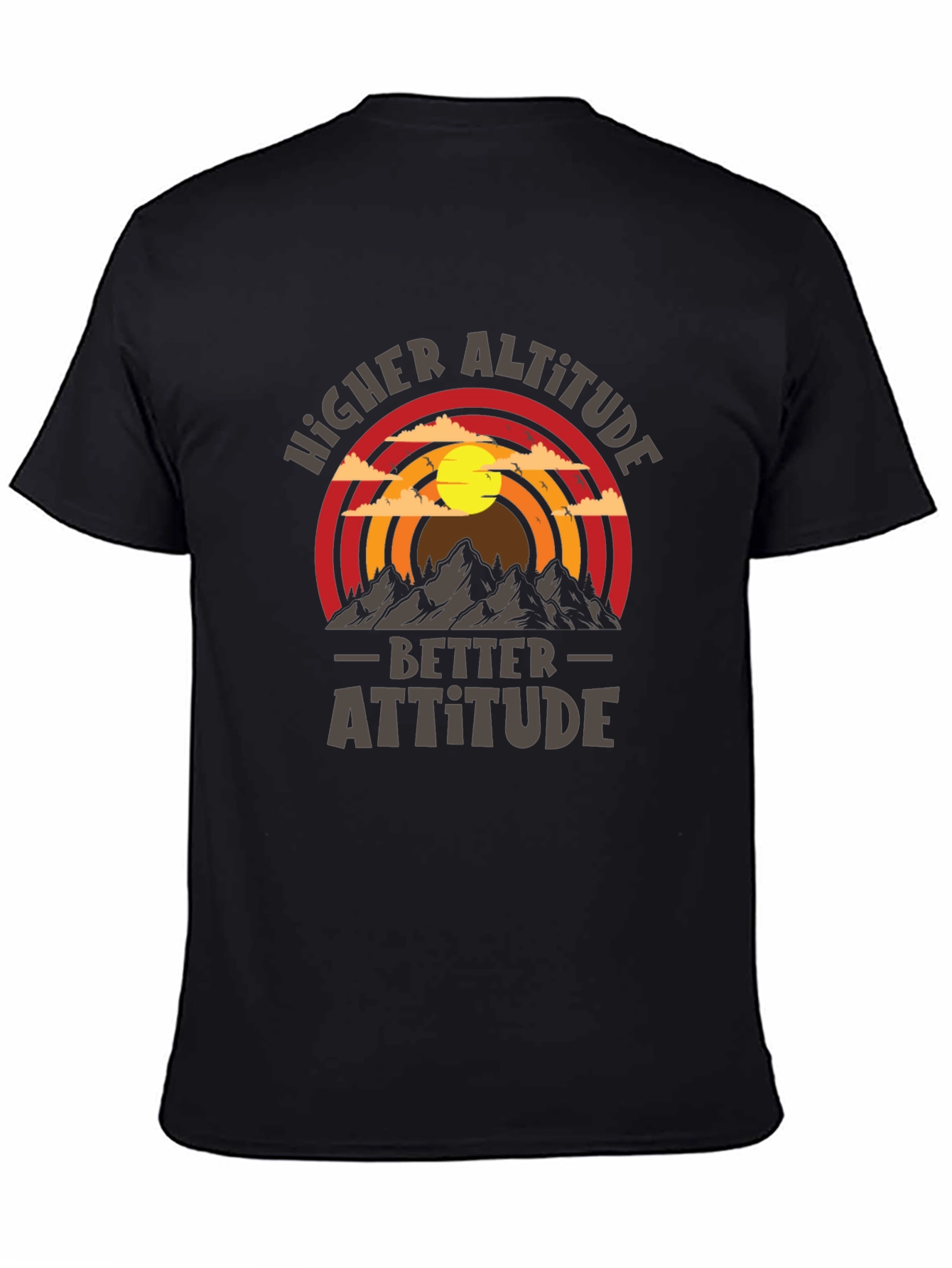 Luce esta camiseta de hombre con un diseño audaz y motivador. Presenta un gráfico estilizado que combina montañas, un sol radiante y un arcoíris en tonos cálidos, junto con la frase inspiradora "Higher Altitude - Better Attitude". Confeccionada en un tejido negro suave y cómodo, esta camiseta de manga corta es perfecta para el uso diario, actividades al aire libre o simplemente para expresar tu espíritu aventurero. Ideal para combinar con jeans o pantalones casuales, esta camiseta te asegurará un estilo relajado pero con personalidad. Una prenda versátil que te invita a alcanzar nuevas metas y mantener una actitud positiva.