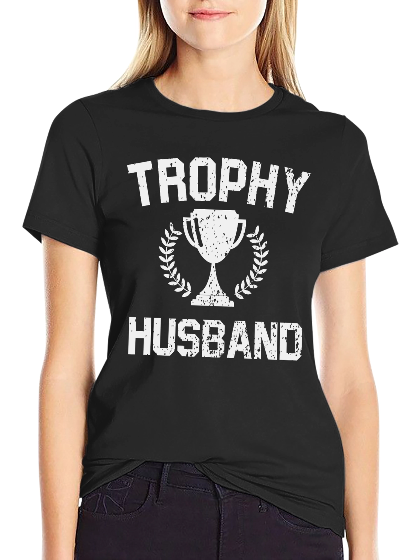 Luce con orgullo esta camiseta negra de hombre que proclama ser un 'Trophy Husband'. El diseño presenta un trofeo clásico rodeado de laureles, con la inscripción 'TROPHY HUSBAND' en letras blancas de estilo desgastado, para un toque vintage y moderno. Fabricada con tela suave y cómoda, esta camiseta de corte regular es perfecta para el uso diario, salidas casuales o para expresar tu sentido del humor. Ideal para regalar a ese esposo que se considera todo un trofeo. Muestra tu personalidad y estilo con esta prenda única y llamativa.