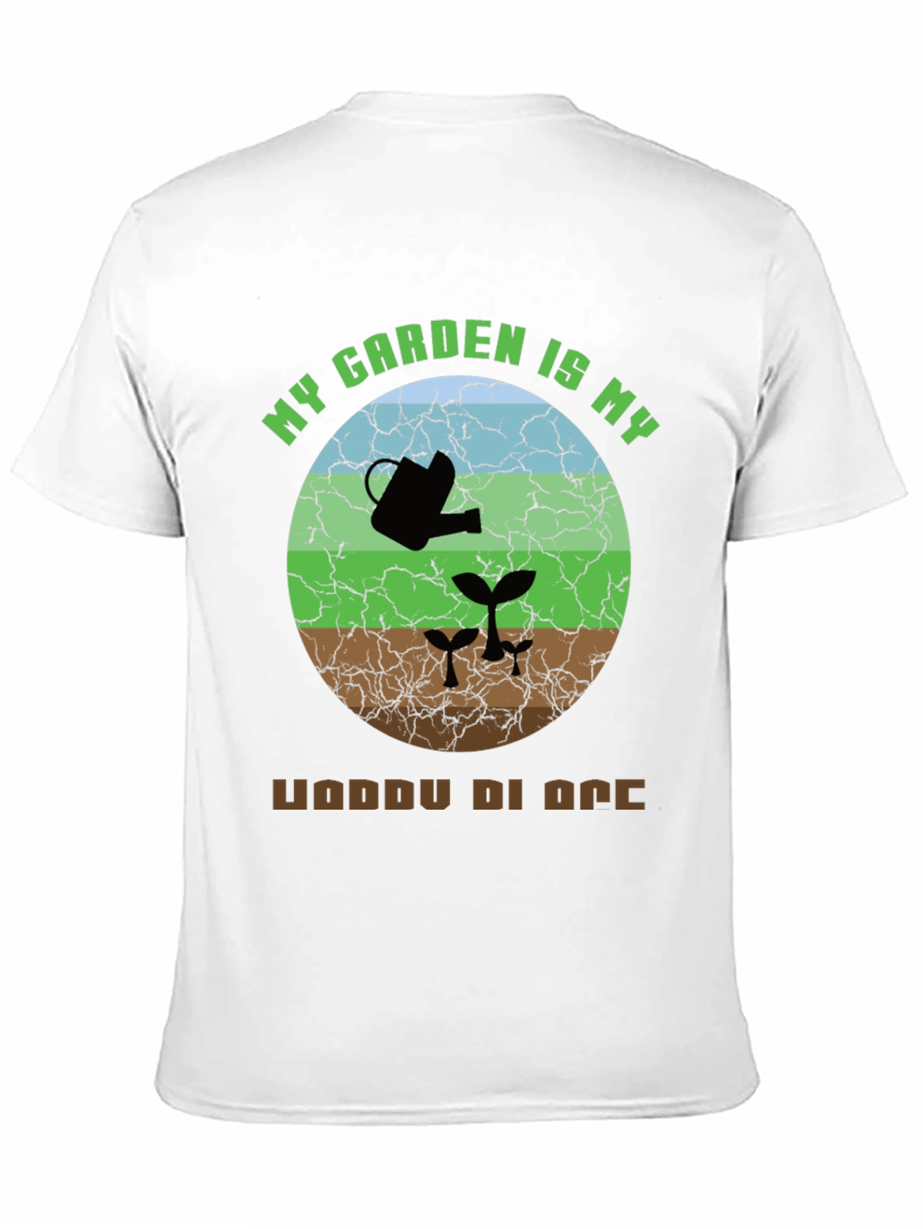 Luce esta camiseta negra con un diseño único. Presenta un círculo con un fondo de cielo azul y tierra verde, que simula un jardín. Una regadera y plántulas completan la escena. La frase "MY GARDEN IS MY ..." y "HAPPY DI ARC" están impresas en letras verdes y marrones respectivamente, rodeando el diseño. Ideal para los amantes de la jardinería, esta camiseta de manga corta es perfecta para usarla en el jardín, salir a pasear o simplemente relajarte en casa. Su diseño llamativo te hará destacar entre la multitud. ¡Muestra tu pasión por la jardinería con estilo!