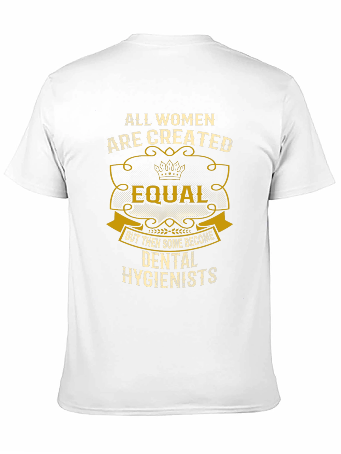 Muestra tu orgullo con esta camiseta de diseño único. Confeccionada en tela suave y transpirable, esta camiseta negra presenta un llamativo estampado dorado con la frase "All women are created equal but then some become dental hygienists". Su diseño original y el mensaje poderoso la hacen ideal para usar en el trabajo, eventos especiales o simplemente para expresar tu personalidad. Perfecta para regalar a higienistas dentales excepcionales.