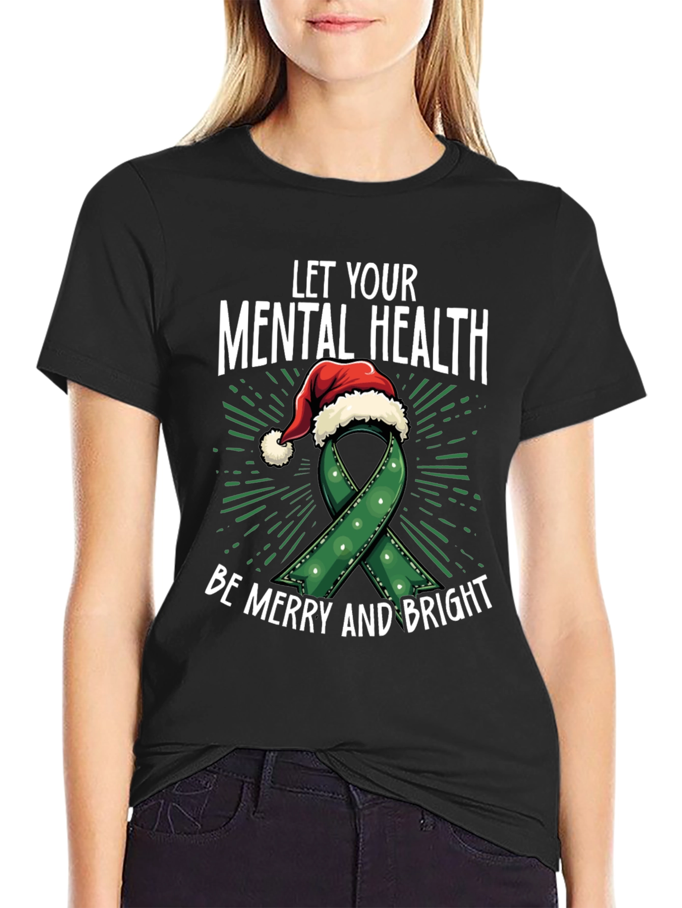Celebra la temporada navideña con esta camiseta única que promueve la salud mental. El diseño presenta un lazo verde, símbolo de la conciencia sobre la salud mental, adornado con un gorro de Papá Noel, dentro de un patrón de rayos. La frase "LET YOUR MENTAL HEALTH BE MERRY AND BRIGHT" está impresa en letras grandes y llamativas. Hecha de un material suave y cómodo, esta camiseta es perfecta para usar en fiestas navideñas, reuniones familiares o simplemente para difundir un mensaje positivo durante la temporada festiva. Muestra tu apoyo a la salud mental con estilo y comparte un mensaje inspirador dondequiera que vayas. Una prenda ideal para regalar y fomentar el bienestar emocional en estas fiestas.