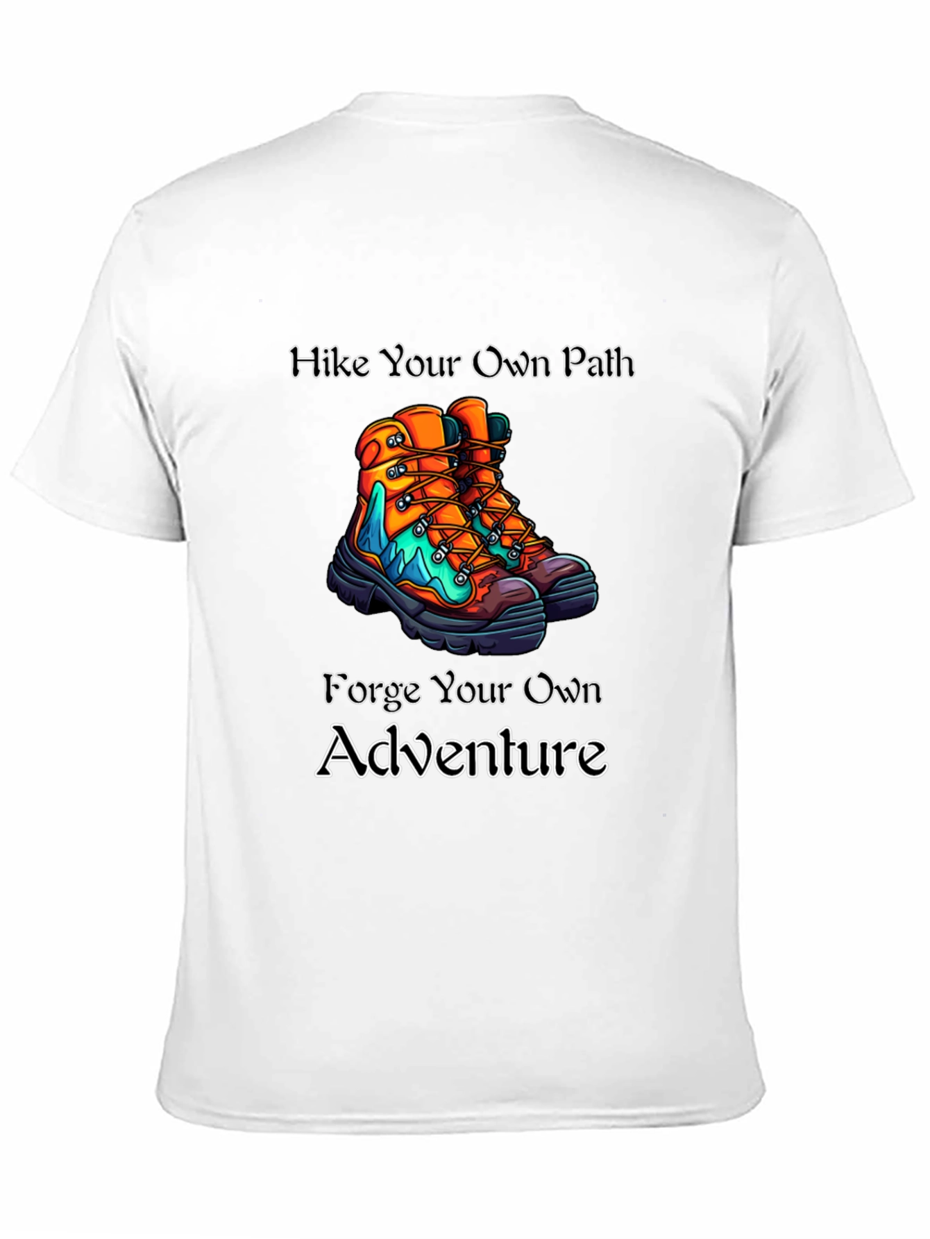 Prepárate para la aventura con esta camiseta negra de diseño único. En el centro, destaca la ilustración de unas botas de montaña de colores vibrantes: naranja, azul y marrón, listas para conquistar cualquier sendero. Sobre las botas, la frase "Hike Your Own Path", y debajo "Forge Your Own Adventure" te invitan a explorar y crear tus propias experiencias. Ideal para los amantes del senderismo, la naturaleza y la aventura. Esta camiseta no solo te viste, sino que también refleja tu espíritu libre y tu pasión por descubrir nuevos horizontes. Llévala en tus próximas excursiones, campamentos o simplemente para expresar tu amor por la vida al aire libre con estilo y comodidad.