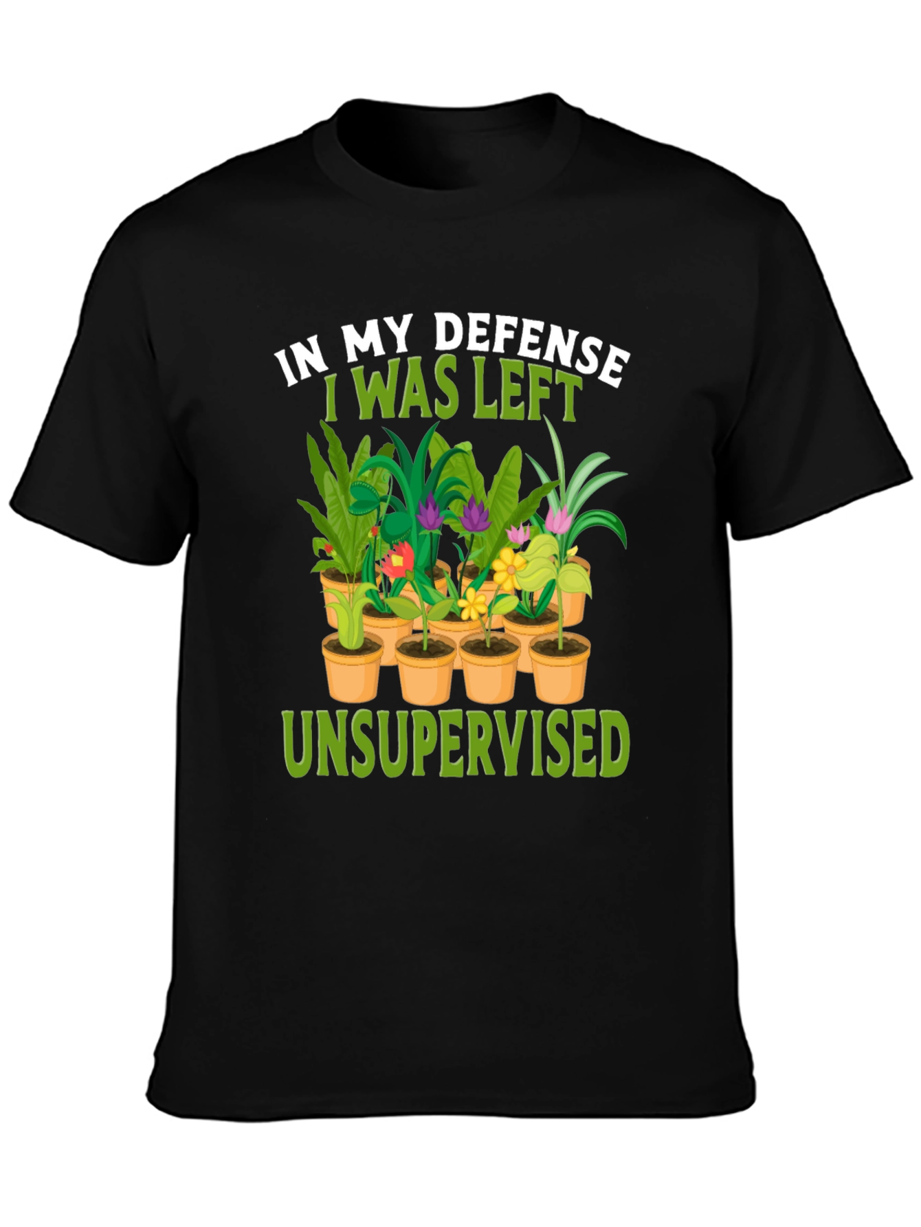 Esta camiseta negra presenta un diseño divertido y original. En la parte frontal se lee "IN MY DEFENSE I WAS LEFT UNSUPERVISED" (En mi defensa, me dejaron sin supervisión), rodeado de ilustraciones de plantas en macetas. Las plantas tienen flores de diversos colores, lo que añade un toque alegre al diseño. Perfecta para los amantes de las plantas con sentido del humor, esta camiseta es ideal para uso casual, salidas informales o como un regalo divertido para un amigo o familiar aficionado a la jardinería. El diseño llamativo seguramente provocará conversaciones y risas.