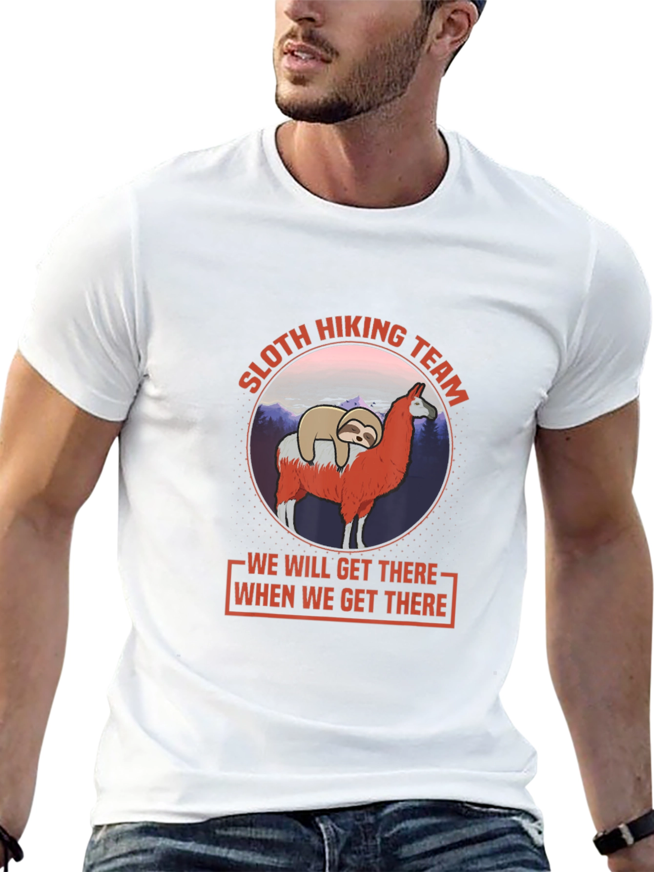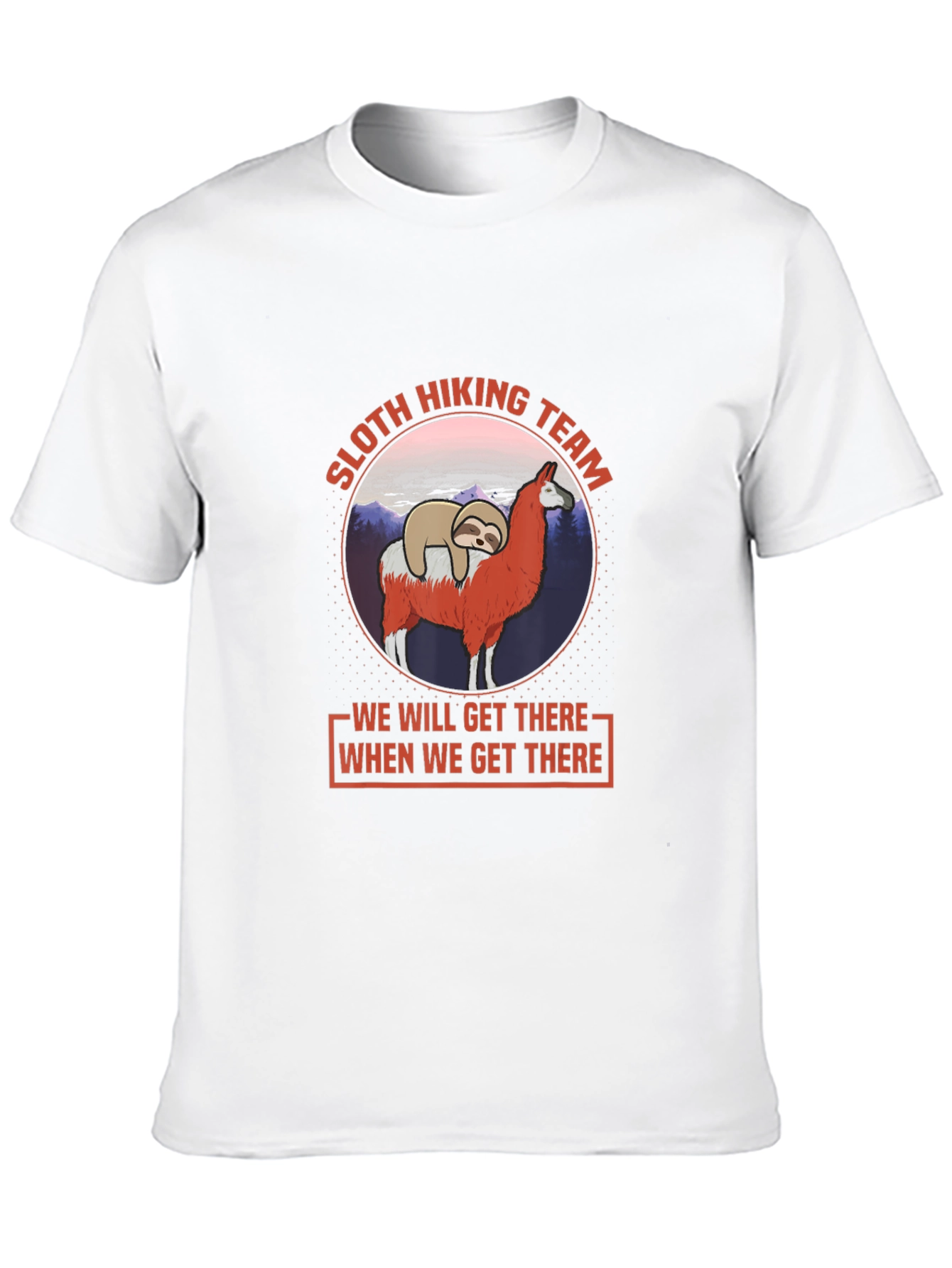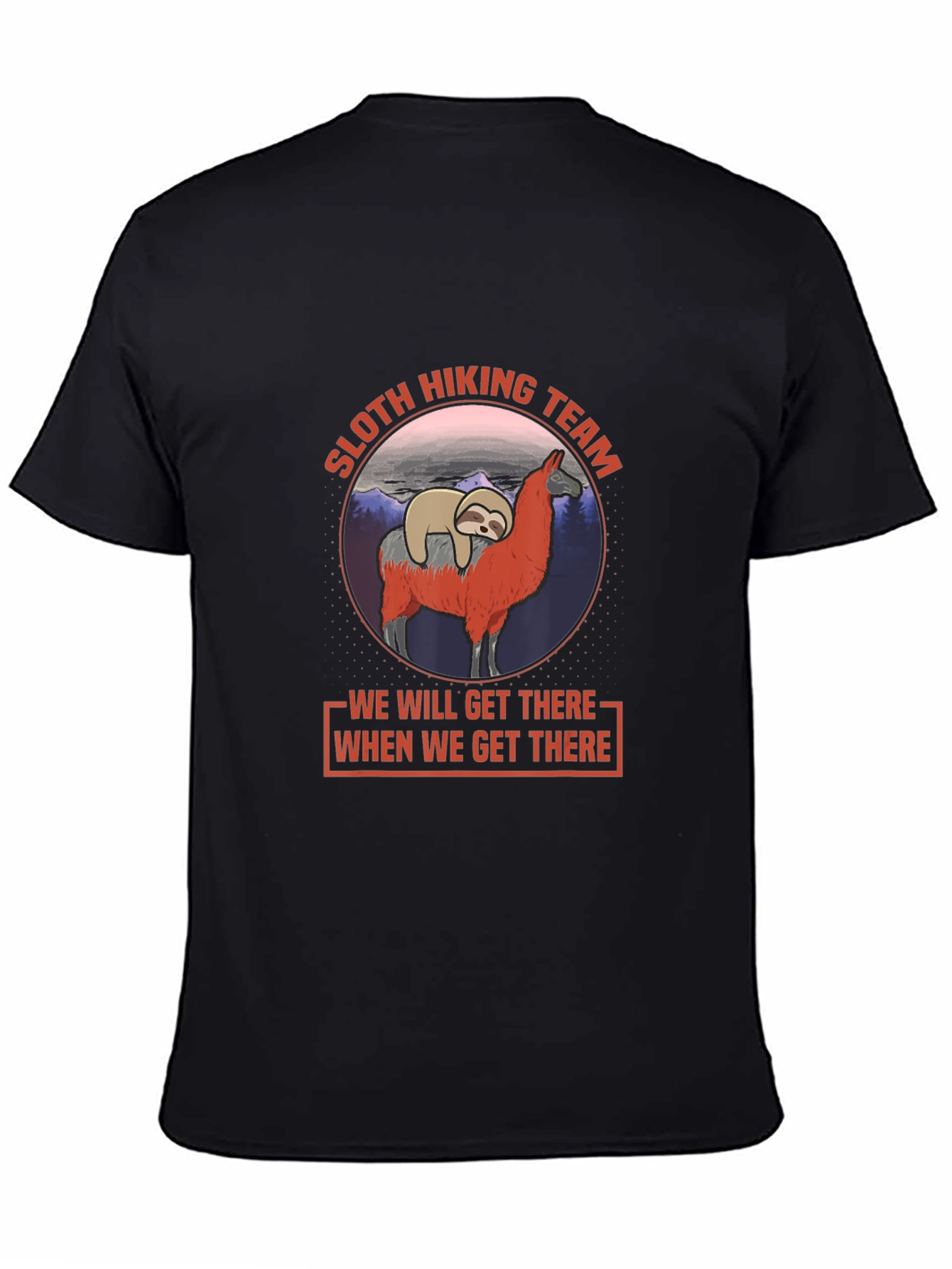Esta camiseta negra presenta un diseño divertido y relajado. Muestra un perezoso durmiendo sobre una llama, acompañado por el texto "Sloth Hiking Team - We will get there when we get there". El diseño sugiere un estilo relajado y sin prisas, ideal para aquellos que disfrutan de la naturaleza a su propio ritmo. Perfecta para amantes de los animales, excursionistas y personas con un sentido del humor. Esta prenda casual es ideal para usar en salidas informales, actividades al aire libre o simplemente para relajarse en casa. Añade un toque de originalidad y comodidad a tu vestuario con esta camiseta única.