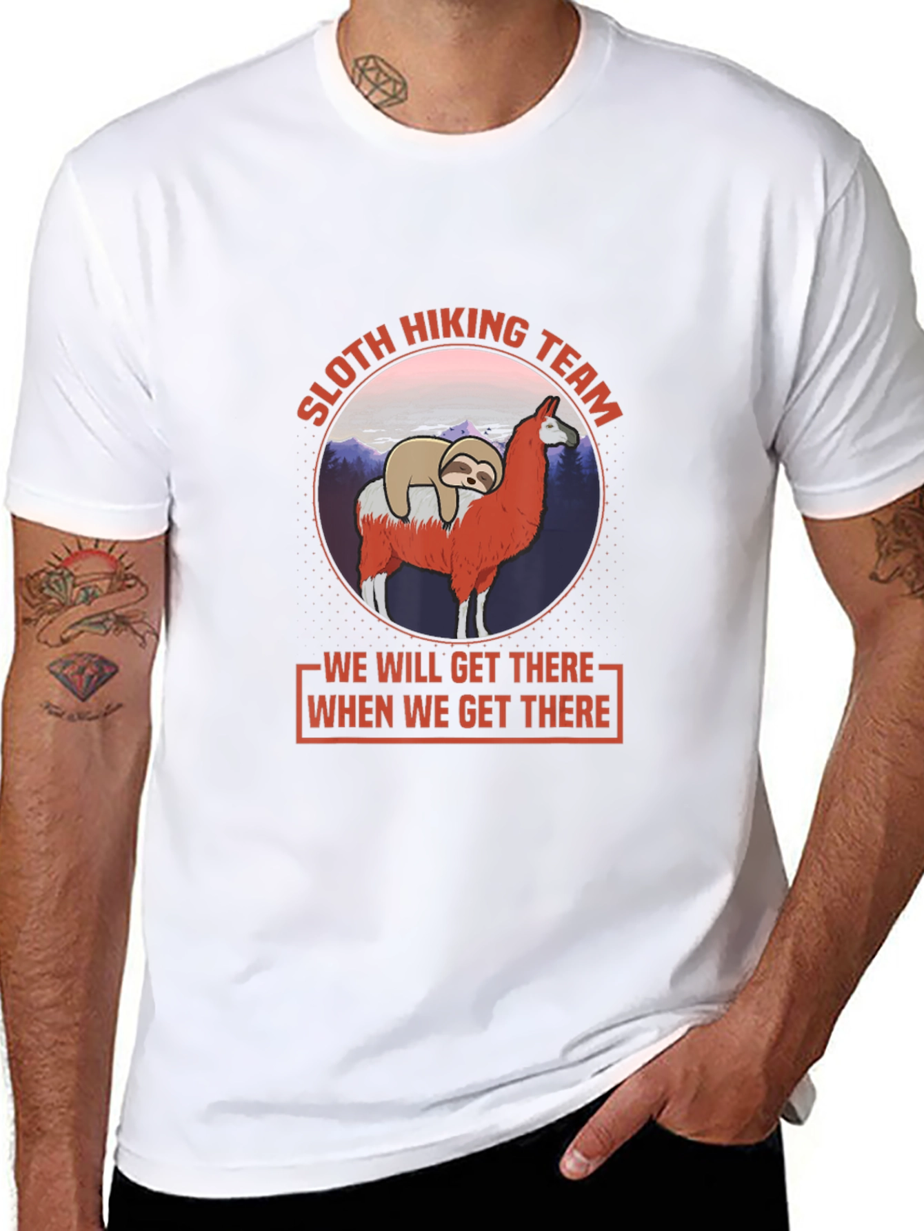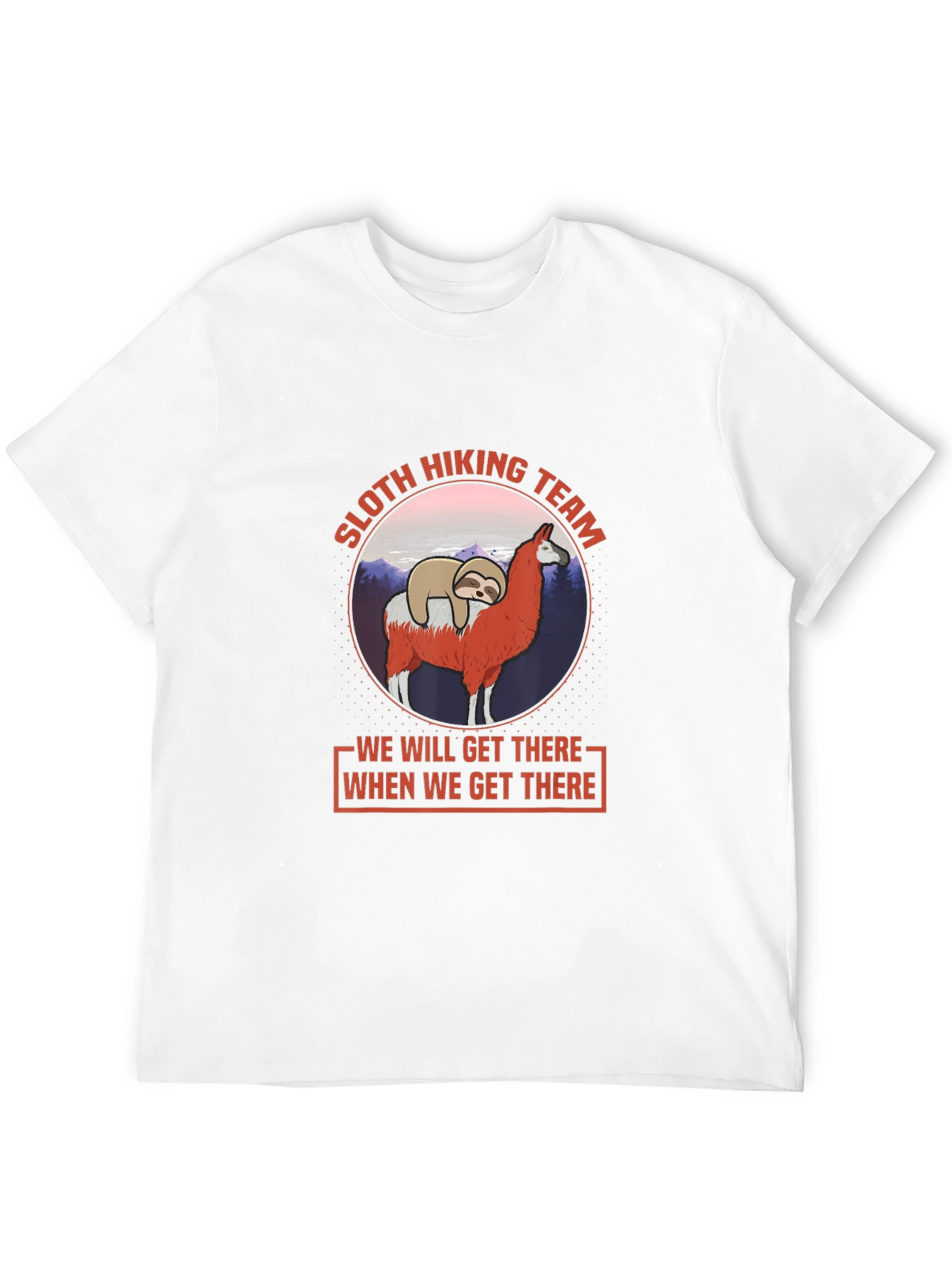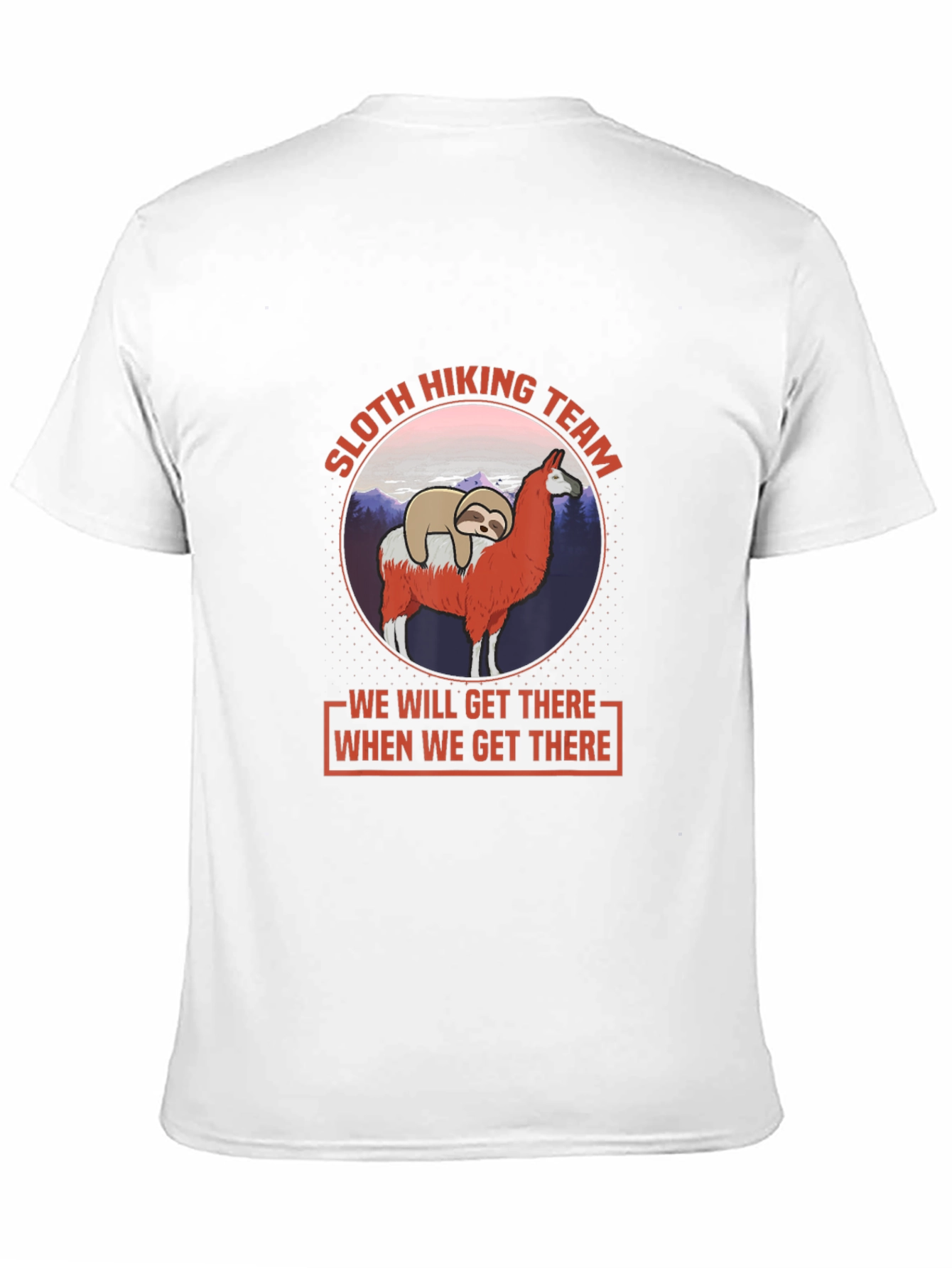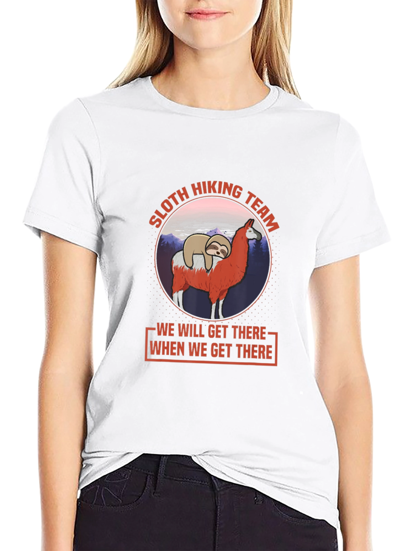 Esta camiseta negra presenta un diseño divertido y relajado. Muestra un perezoso durmiendo sobre una llama, acompañado por el texto "Sloth Hiking Team - We will get there when we get there". El diseño sugiere un estilo relajado y sin prisas, ideal para aquellos que disfrutan de la naturaleza a su propio ritmo. Perfecta para amantes de los animales, excursionistas y personas con un sentido del humor. Esta prenda casual es ideal para usar en salidas informales, actividades al aire libre o simplemente para relajarse en casa. Añade un toque de originalidad y comodidad a tu vestuario con esta camiseta única.