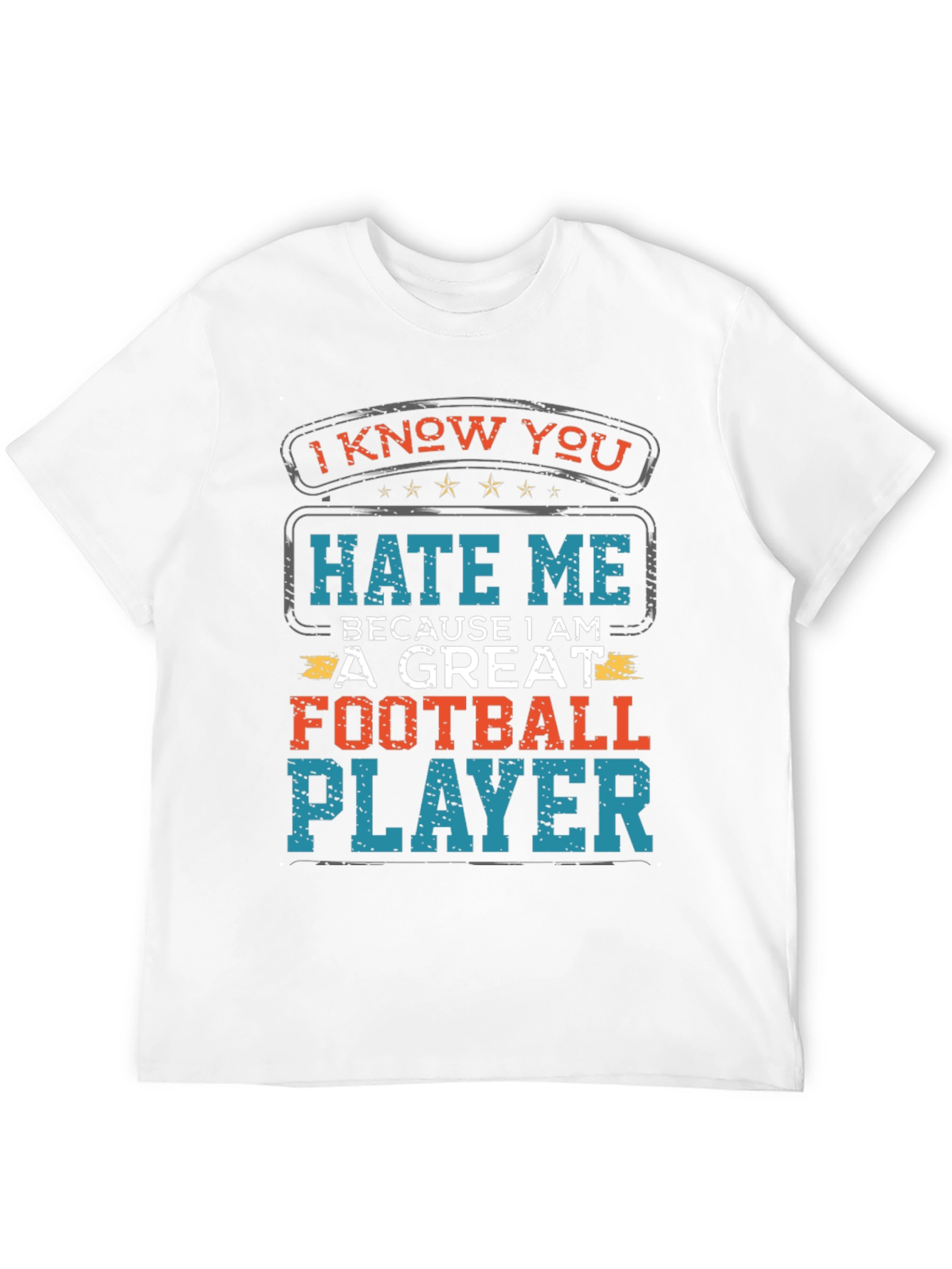 Esta camiseta negra de manga corta presenta un diseño llamativo perfecto para los amantes del fútbol. En la parte delantera, se lee "I KNOW YOU HATE ME BECAUSE I AM A GREAT FOOTBALL PLAYER" en letras audaces, con una combinación de colores naranja y azul que destacan sobre el fondo oscuro. El diseño tiene un estilo vintage o retro. Ideal para usar en partidos, entrenamientos o simplemente para mostrar tu pasión por el fútbol. Es una prenda cómoda y casual que expresa confianza y habilidad en el campo. Demuestra tu talento futbolístico con esta camiseta única y atrevida.