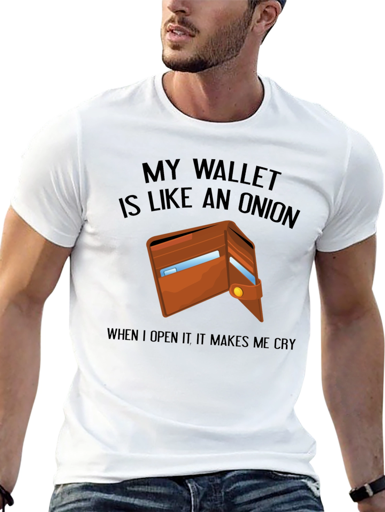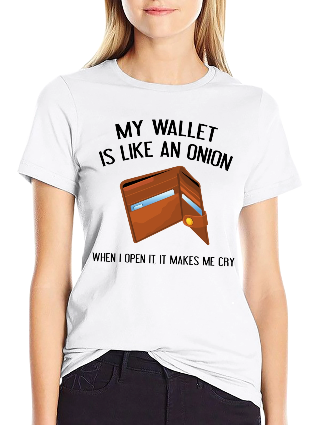 Luce esta camiseta negra con un diseño único y divertido. Presenta la frase "Mi Billetera es Como una Cebolla, Cuando La Abro Me Hace Llorar", acompañada de una ilustración de una billetera. Ideal para aquellos con sentido del humor y que disfrutan de prendas originales. Perfecta para uso casual, salidas con amigos o como un regalo ingenioso. Muestra tu personalidad con esta cómoda y llamativa camiseta que seguro sacará una sonrisa a quien la vea.