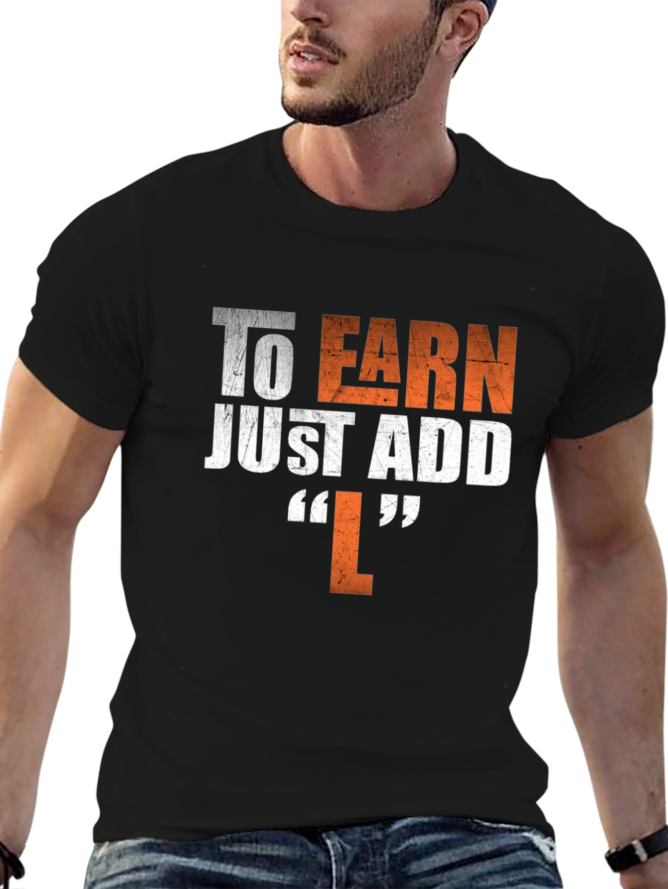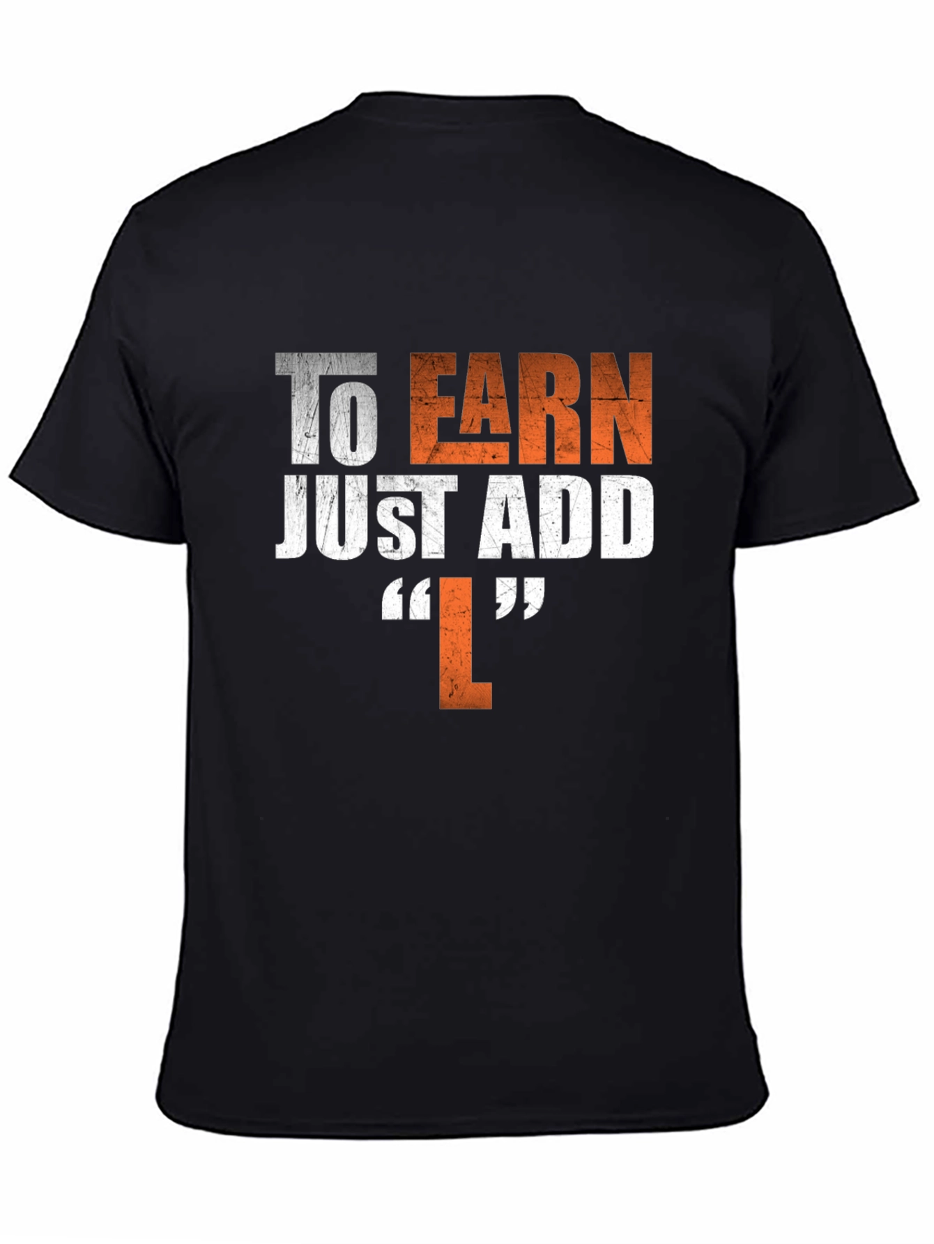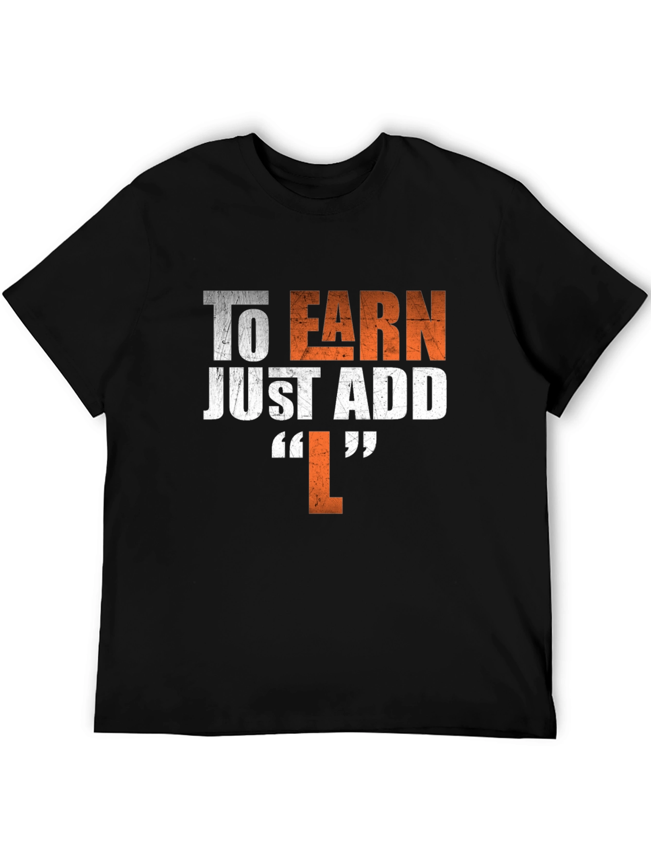Descubre esta camiseta negra de manga corta con un diseño ingenioso y llamativo. En el pecho, destaca la frase "Para Ganar, Solo Añade 'L'", con las palabras "EARN" y la letra "L" en color naranja, creando un efecto visual impactante. El resto del texto está en blanco, ofreciendo un contraste moderno y fácil de leer. Ideal para quienes buscan una prenda original y con un toque de humor, esta camiseta es perfecta para lucir en el día a día, ya sea para salir con amigos, ir al gimnasio o simplemente relajarse en casa. Su diseño versátil la convierte en una excelente opción para combinar con jeans, pantalones cortos o incluso debajo de una chaqueta. ¡Añade un toque de estilo único a tu guardarropa con esta camiseta!