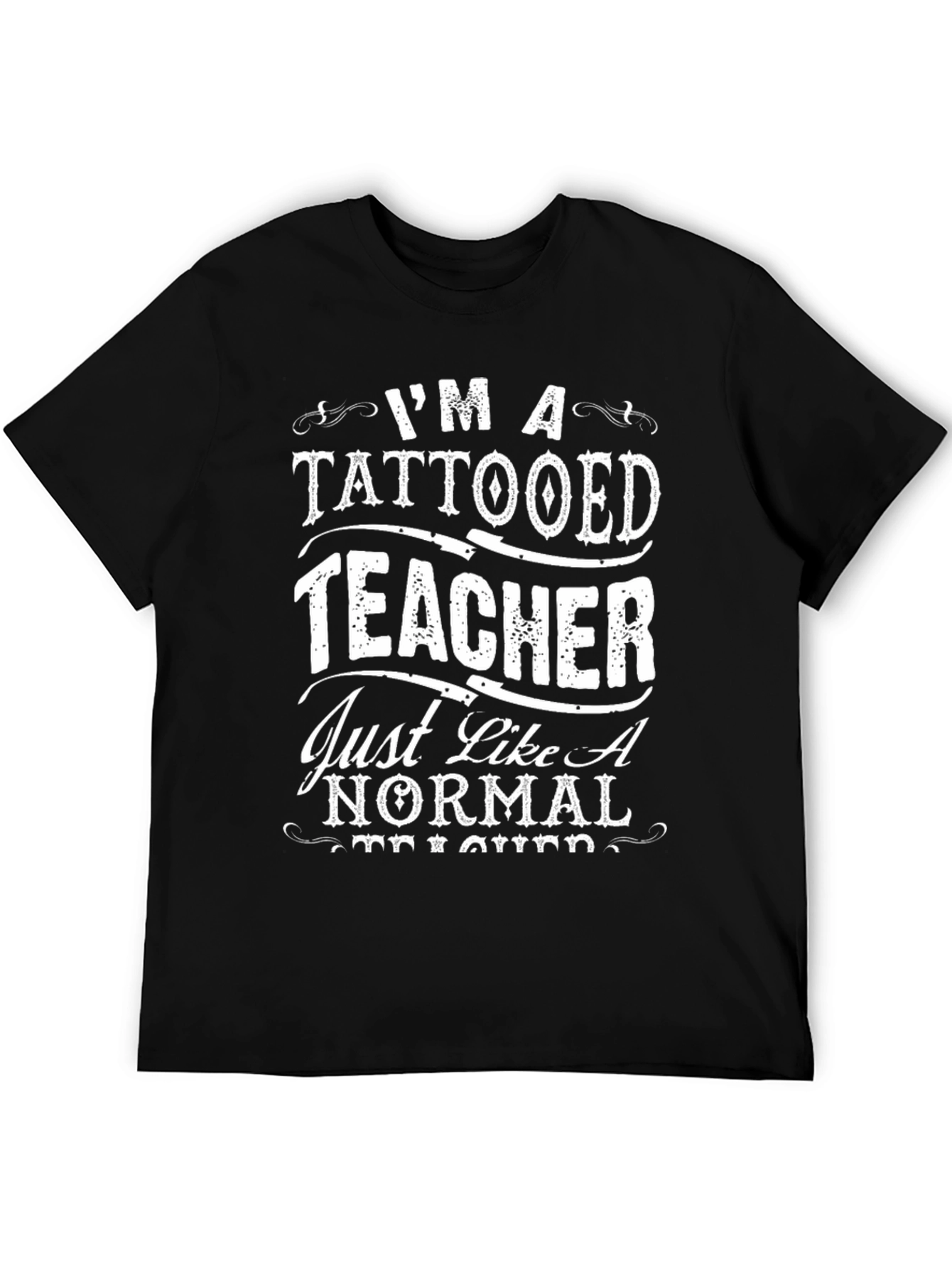 Esta camiseta negra presenta un diseño audaz y llamativo. La frase "I'M A TATTOOED TEACHER Just Like A NORMAL" está estampada en blanco con un estilo de fuente distintivo. La camiseta de manga corta parece estar hecha de un material suave y cómodo, ideal para el uso diario. Perfecta para profesores orgullosos de sus tatuajes que buscan expresar su individualidad con un toque de humor. Úsala para clases informales, salidas de fin de semana o como una declaración de estilo personal.