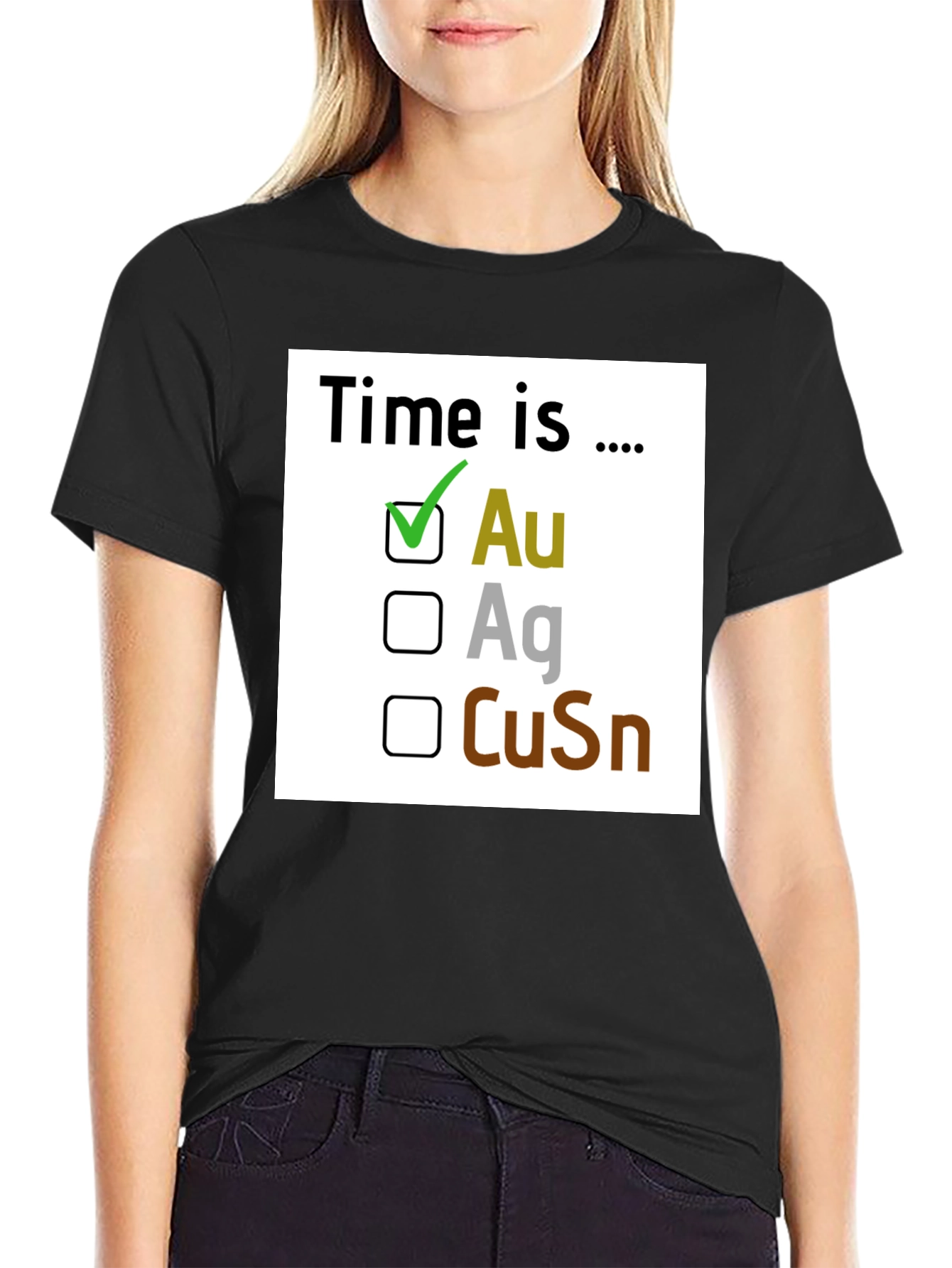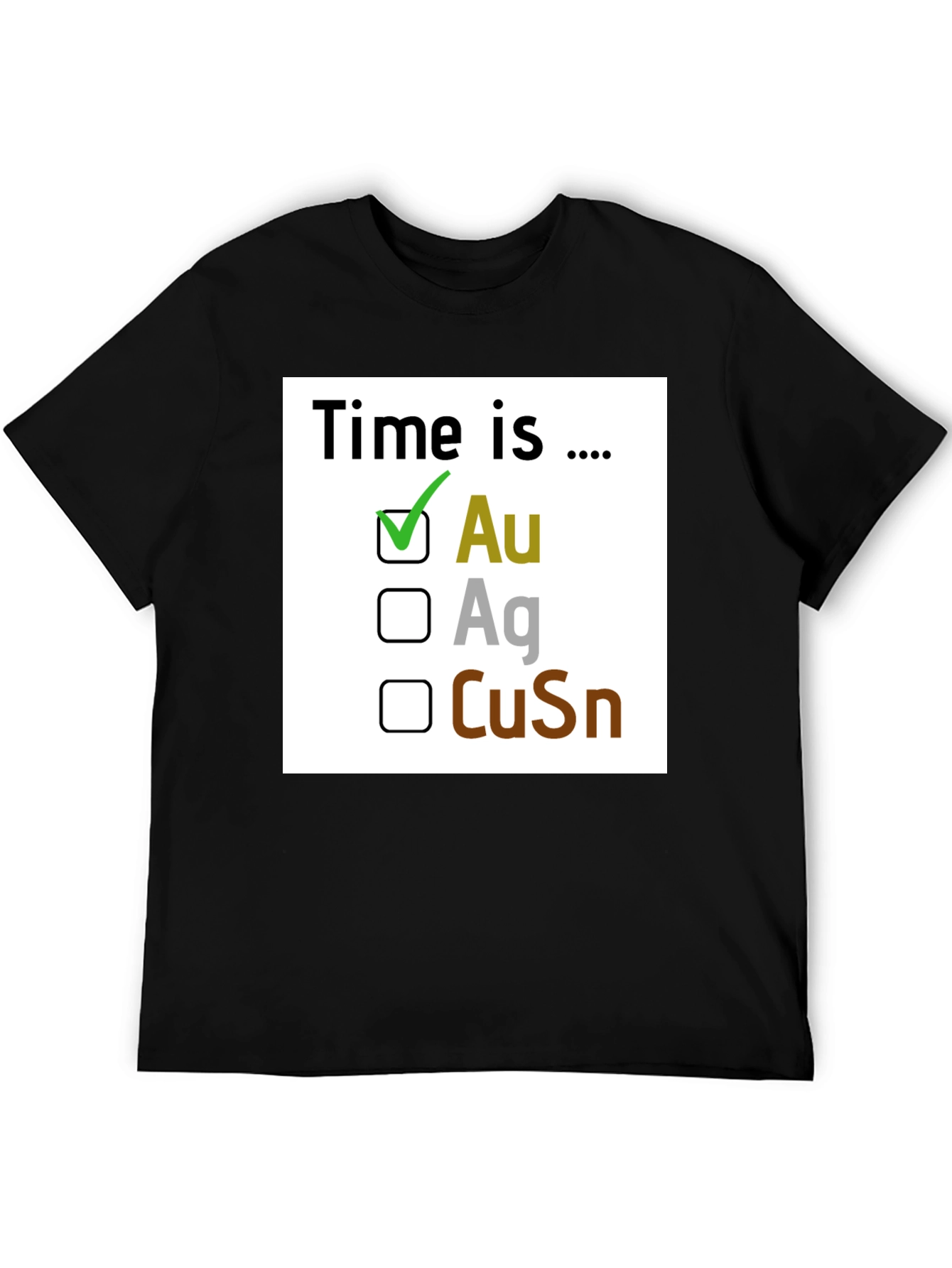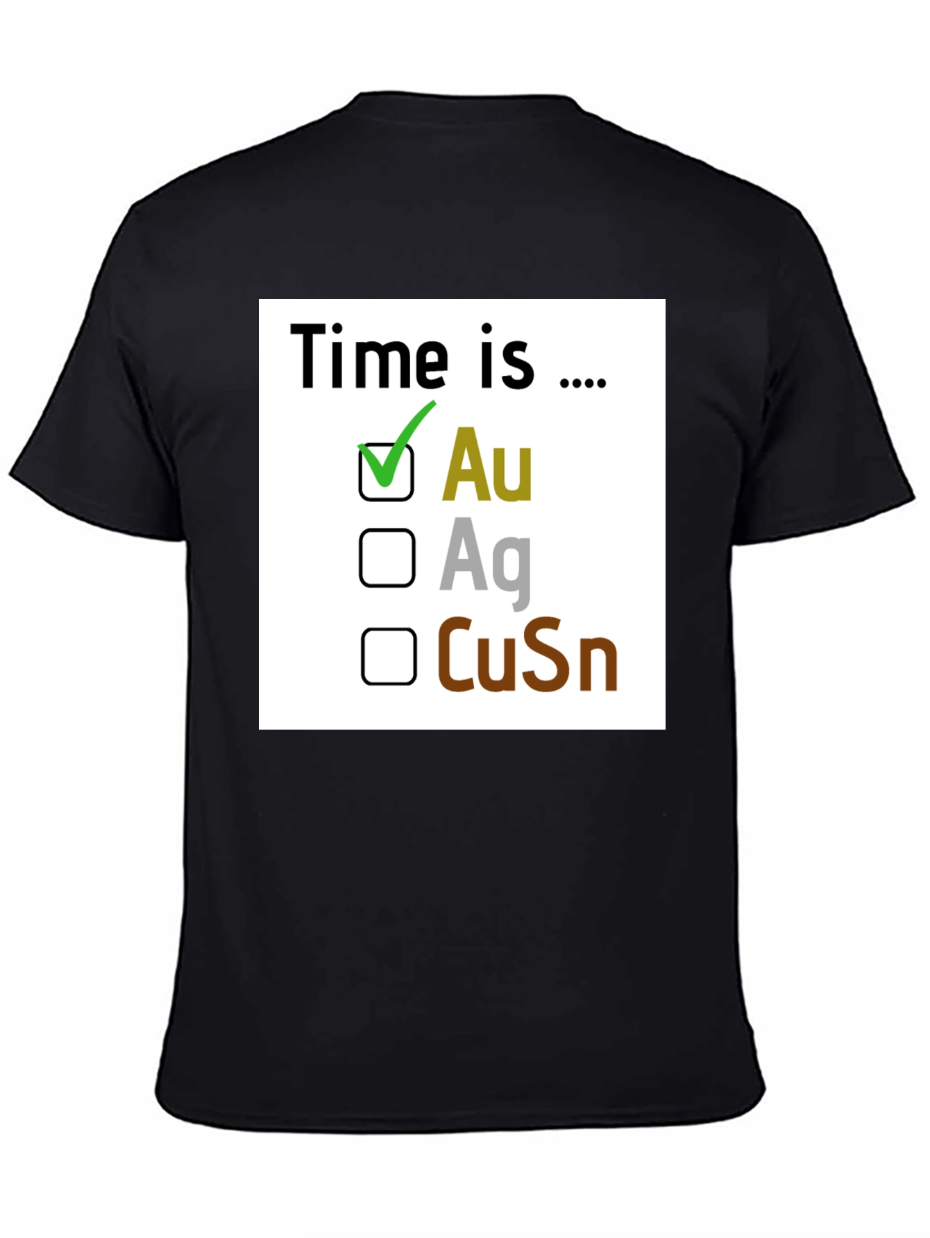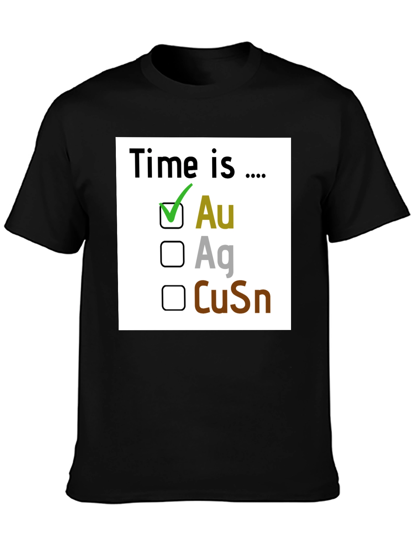 Muestra tu amor por la química con esta camiseta negra de manga corta. La camiseta presenta un diseño divertido con la frase "Time is....", acompañado de un cuadro con la opción "Au" (oro) marcada con una palomita verde. Las opciones "Ag" (plata) y "CuSn" (bronce) están disponibles pero sin marcar. Perfecta para estudiantes de química, profesores, o cualquier persona con un sentido del humor científico. Fabricada con materiales suaves y cómodos, ideal para usar en el aula, reuniones informales o eventos relacionados con la ciencia. Un regalo original y divertido para cualquier amante de la tabla periódica.