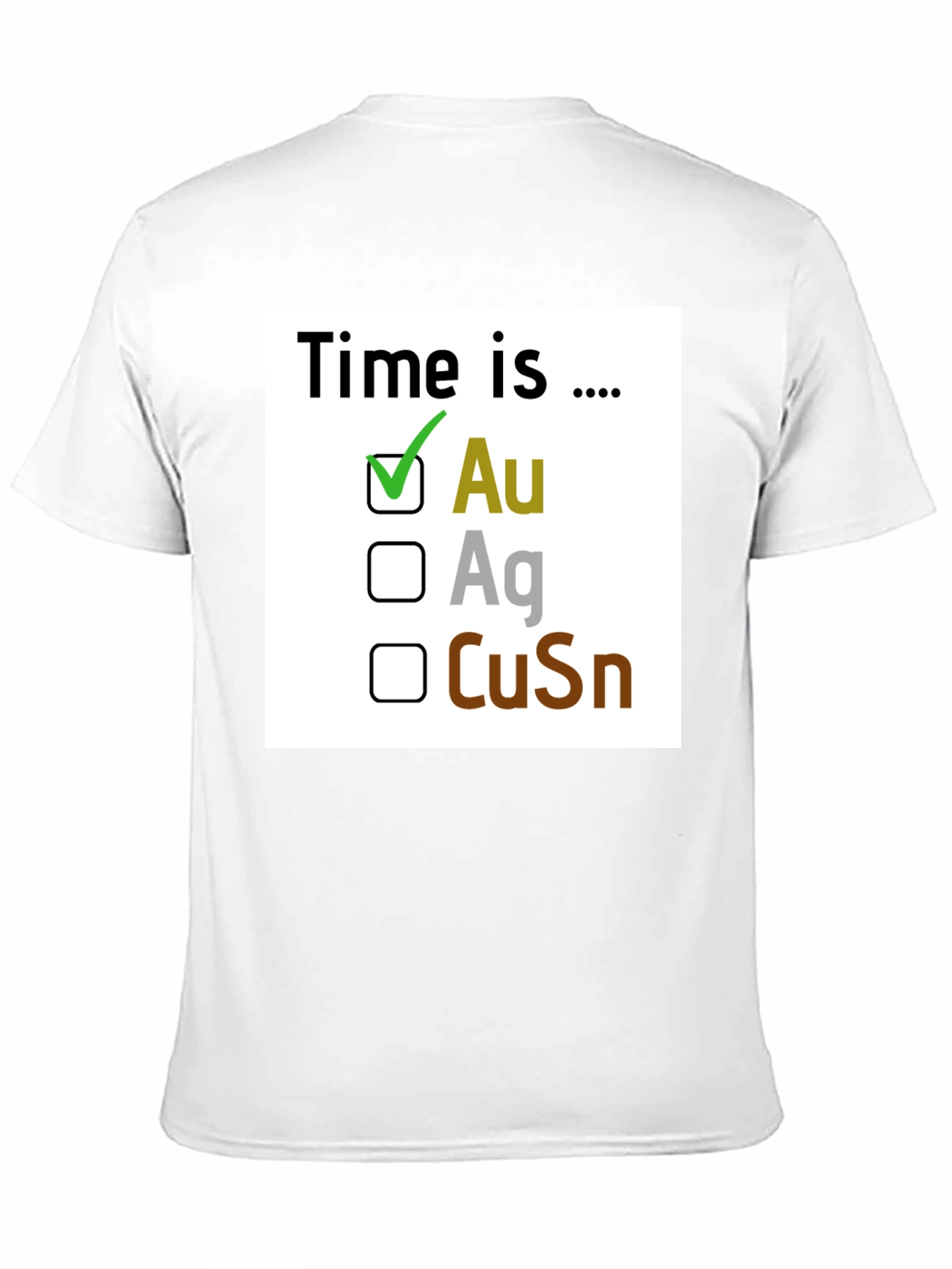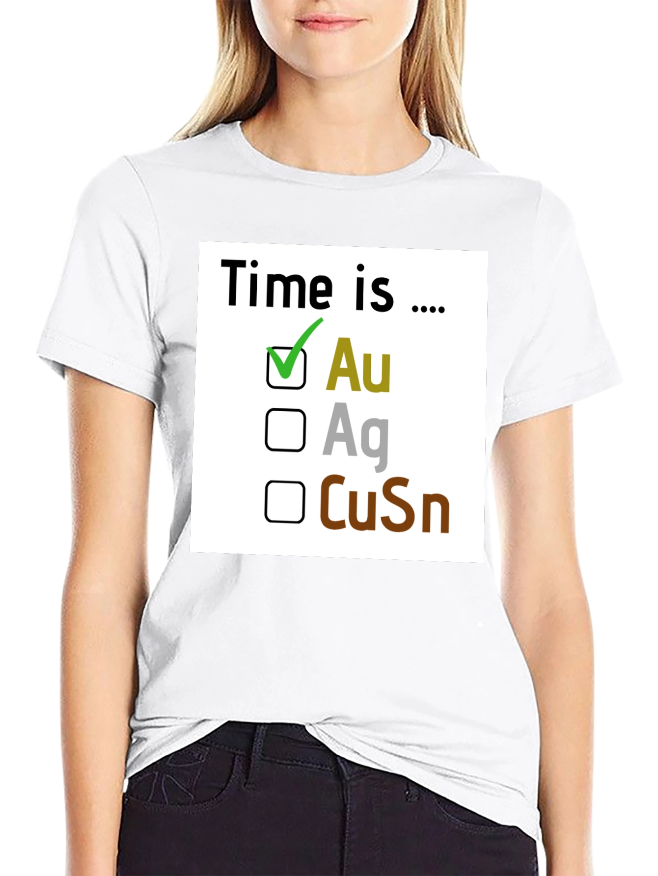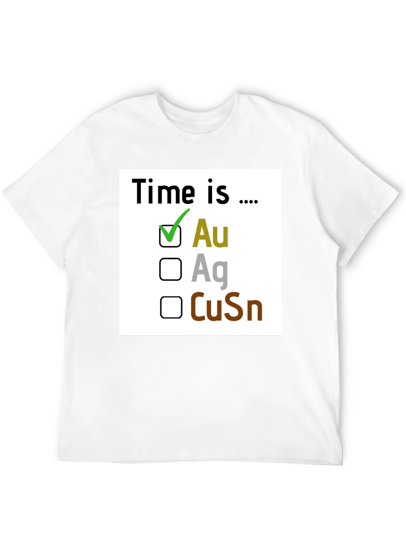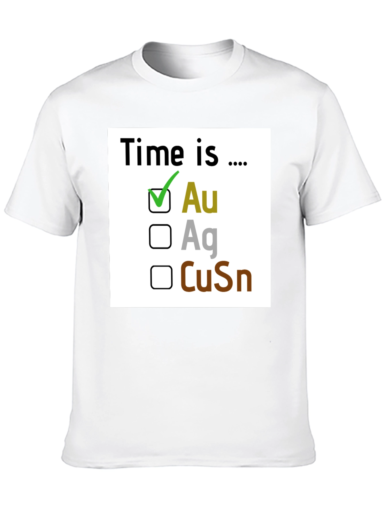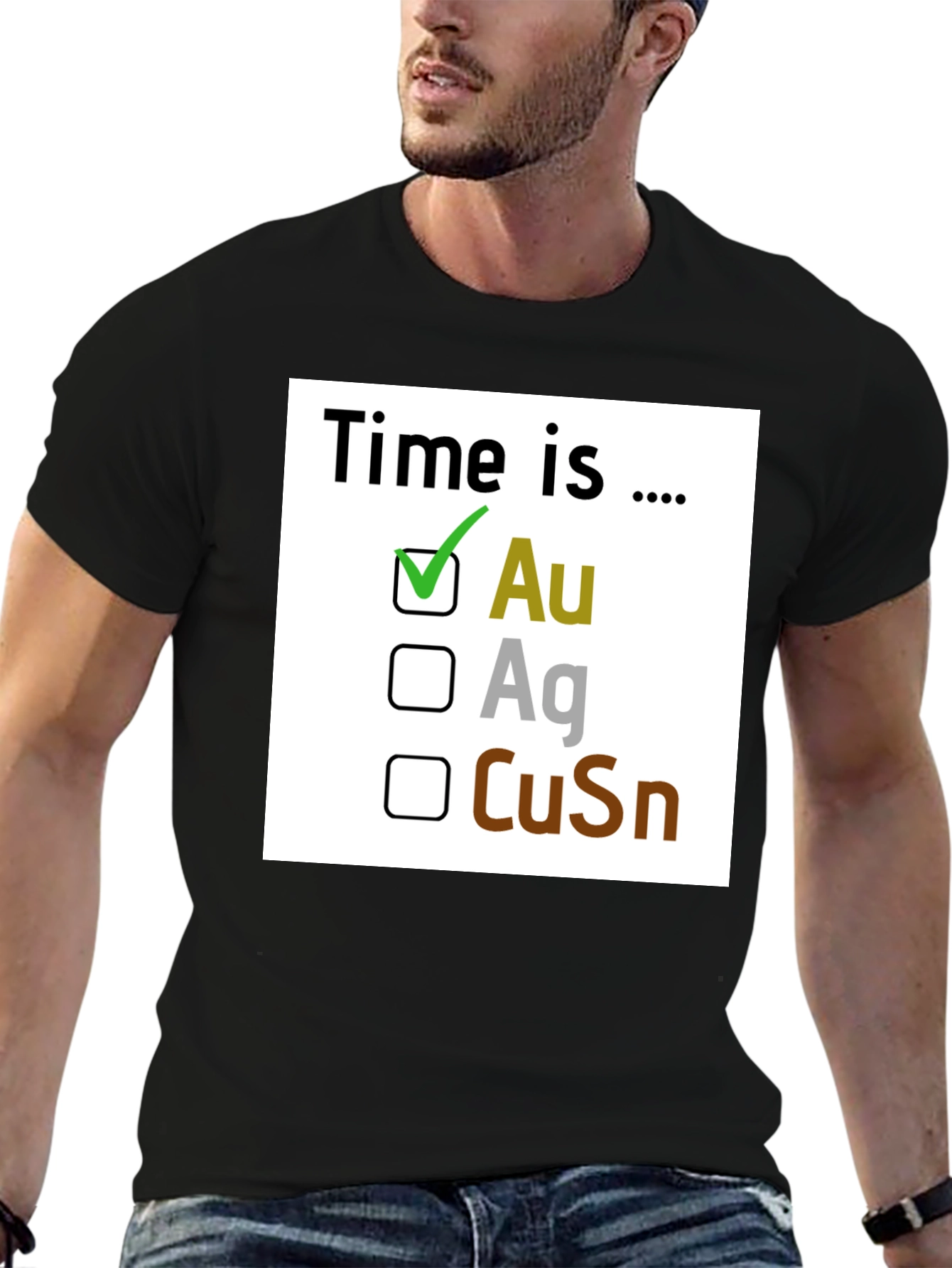 Muestra tu amor por la química con esta camiseta negra de manga corta. La camiseta presenta un diseño divertido con la frase "Time is....", acompañado de un cuadro con la opción "Au" (oro) marcada con una palomita verde. Las opciones "Ag" (plata) y "CuSn" (bronce) están disponibles pero sin marcar. Perfecta para estudiantes de química, profesores, o cualquier persona con un sentido del humor científico. Fabricada con materiales suaves y cómodos, ideal para usar en el aula, reuniones informales o eventos relacionados con la ciencia. Un regalo original y divertido para cualquier amante de la tabla periódica.