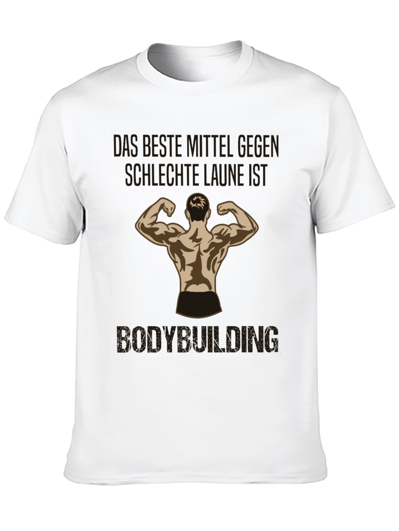 Luce esta camiseta negra con un diseño llamativo. En el frente, destaca una ilustración de un fisicoculturista mostrando sus músculos, junto con el texto "DAS BESTE MITTEL GEGEN SCHLECHTE LAUNE IST BODYBUILDING". Perfecta para los amantes del gimnasio, el fitness y el estilo urbano. Fabricada con materiales de alta calidad, esta camiseta ofrece comodidad y durabilidad. Ideal para usar en tus entrenamientos o para un look casual y relajado. Combina con tus jeans o pantalones deportivos favoritos y muestra tu pasión por el bodybuilding.