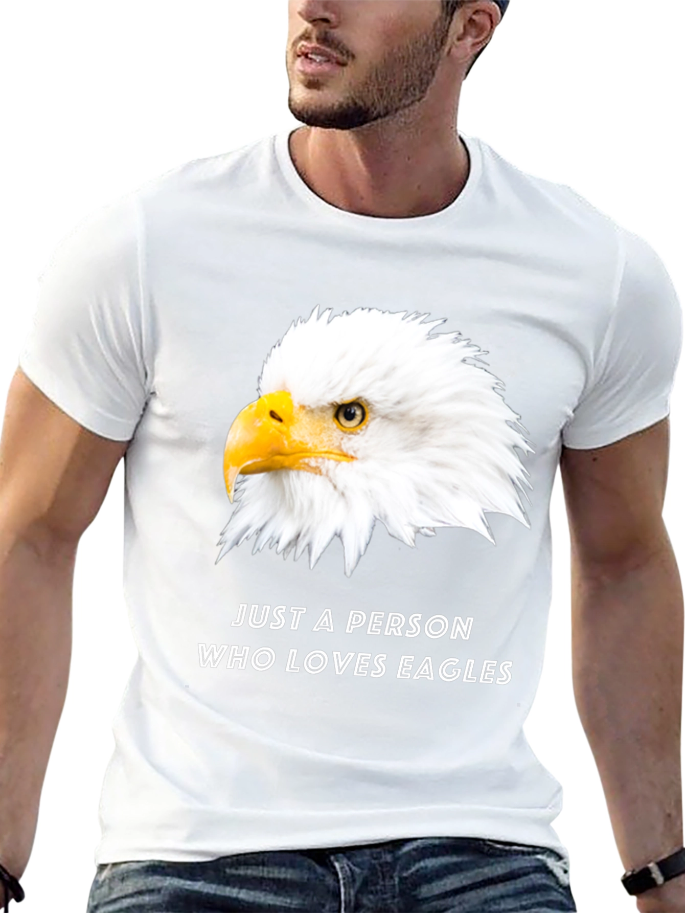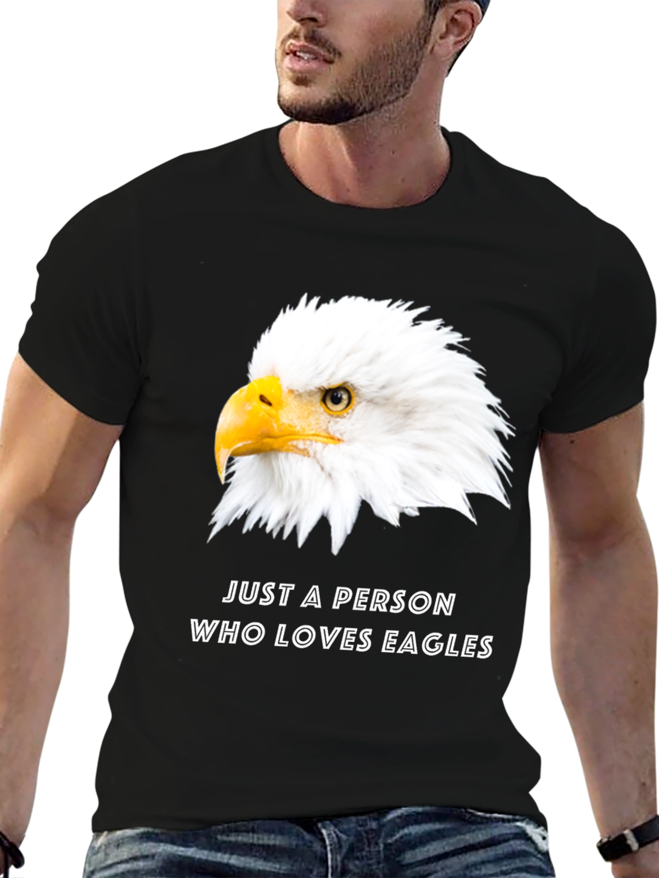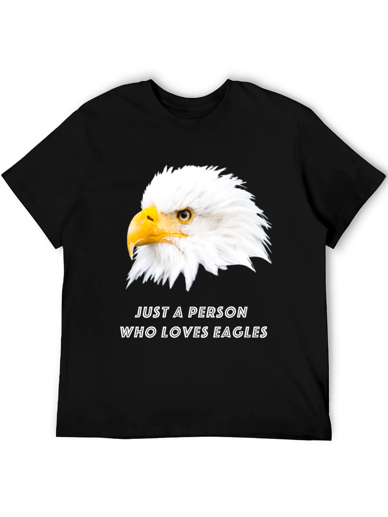 Demuestra tu amor por las águilas con esta camiseta negra de manga corta. Presenta una imagen llamativa de la cabeza de un águila calva en el frente, acompañada del texto "JUST A PERSON WHO LOVES EAGLES". Fabricada con un material suave y cómodo, esta camiseta es perfecta para el uso diario y es ideal para cualquier amante de las aves rapaces. Su diseño clásico y su ajuste relajado la convierten en una prenda versátil para combinar con jeans, pantalones cortos o joggers. Muestra tu pasión por la naturaleza con esta camiseta única y original.