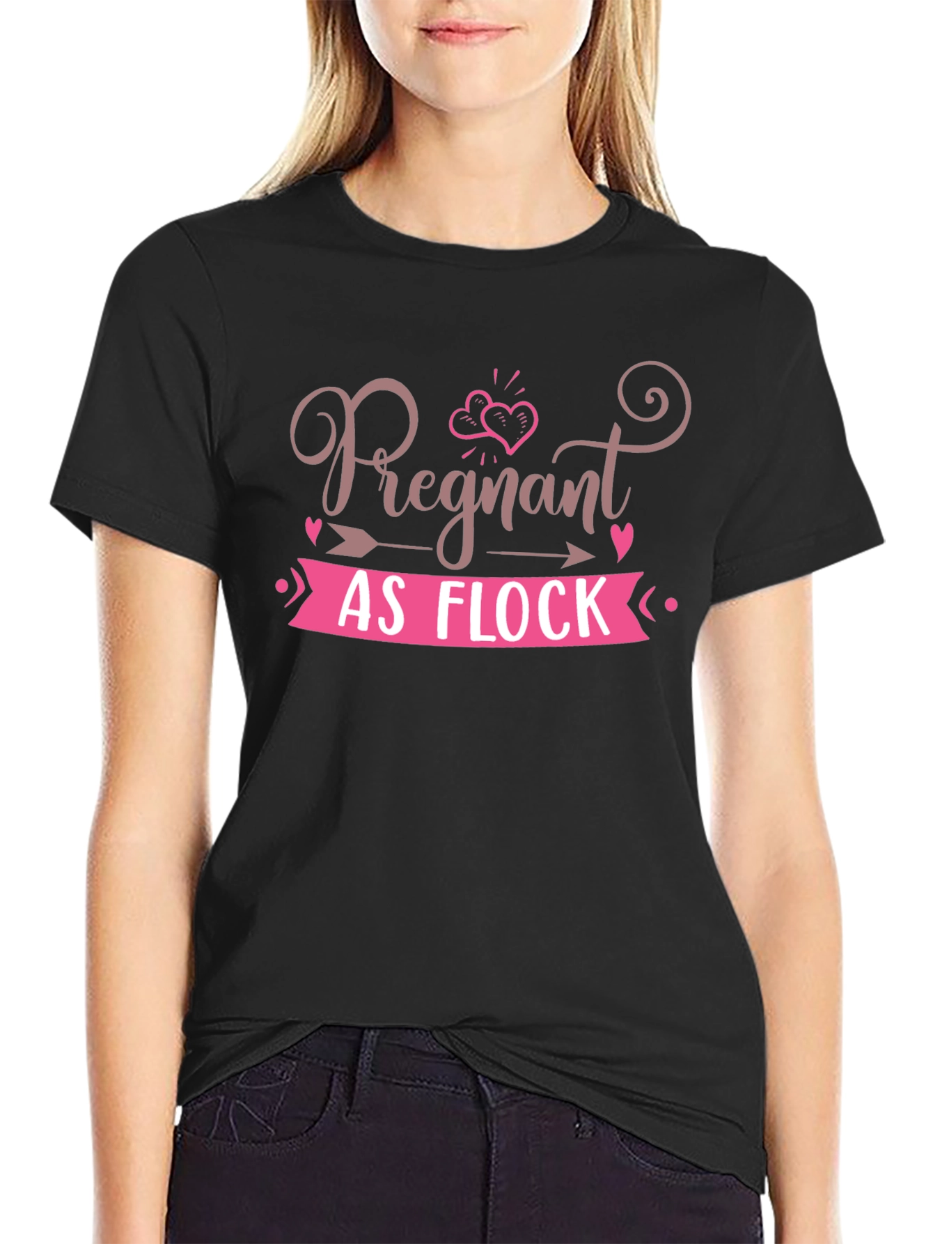 Luce con orgullo esta camiseta negra de corte clásico y diseño único. La prenda presenta un estampado divertido en tonos rosas y marrones con el texto "Pregnant AS FLOCK" decorado con corazones y flechas, ideal para futuras mamás con sentido del humor. Perfecta para usar durante el embarazo, en reuniones informales con amigos o como un regalo original y creativo para una embarazada. Su tejido suave y cómodo garantiza un ajuste perfecto y libertad de movimiento. Demuestra tu alegría y estilo con esta camiseta que celebra la maternidad de una forma original.