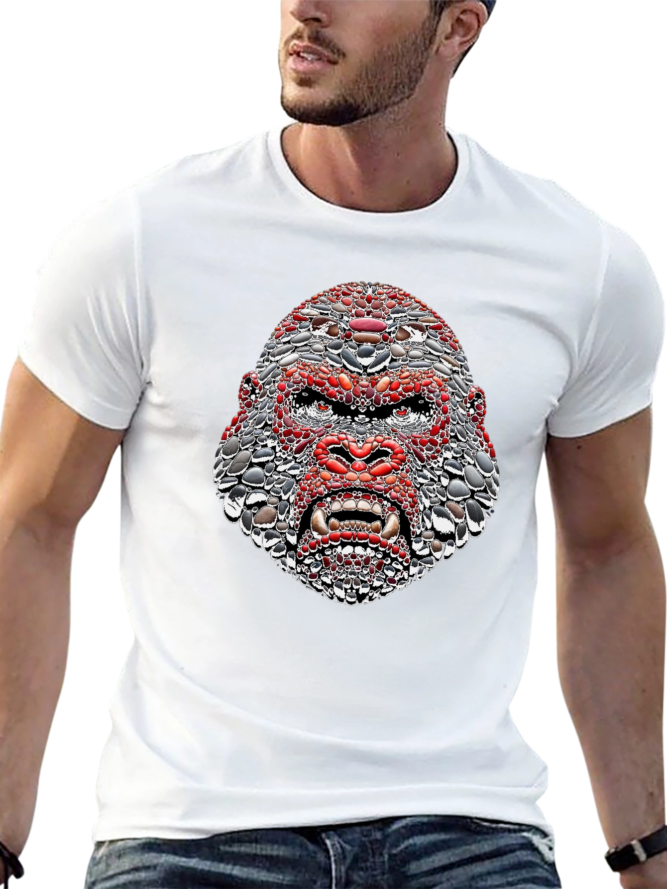 Destaca con esta camiseta negra de manga corta que presenta un impresionante diseño abstracto de la cara de un gorila. La elaborada ilustración, compuesta de intrincadas formas que simulan piedras o gemas, crea un efecto visual llamativo y moderno. Con una paleta de colores que incluye tonos rojos, grises y blancos, la camiseta ofrece un contraste impactante sobre el fondo negro. Perfecta para quienes buscan una prenda original y llamativa, esta camiseta es ideal para expresar tu individualidad y pasión por la moda. Llévala para añadir un toque artístico y audaz a tu atuendo casual.