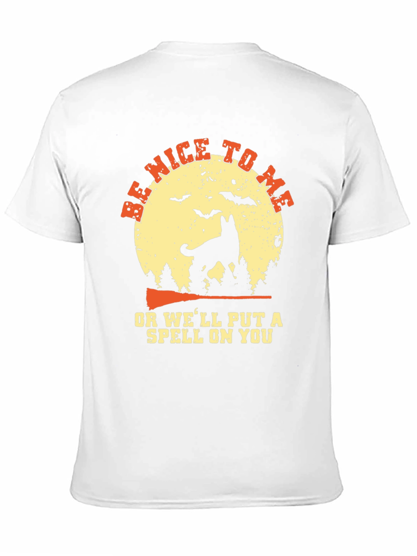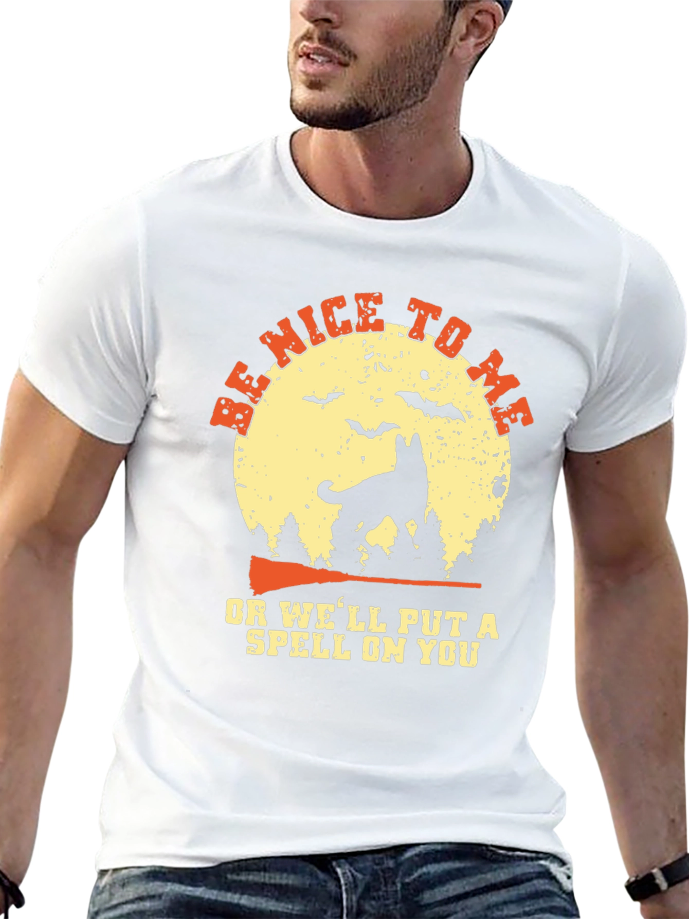 Luce esta camiseta negra con un diseño temático perfecto para Halloween. Presenta un llamativo gráfico en tonos anaranjados y amarillos que incluye la frase "BE NICE TO ME OR WE'LL PUT A SPELL ON YOU" (Sé bueno conmigo o te hechizaremos). El diseño central muestra la silueta de un perro frente a una luna llena, árboles y murciélagos, creando una atmósfera misteriosa y divertida. Ideal para fiestas de Halloween, reuniones con amigos o simplemente para expresar tu espíritu festivo. Confeccionada en un material suave y cómodo, esta camiseta de manga corta es perfecta para usar durante todo el día. Atrévete a destacar con este estilo único y original. ¡Prepárate para recibir elogios y disfrutar de la temporada de Halloween con esta prenda imprescindible!