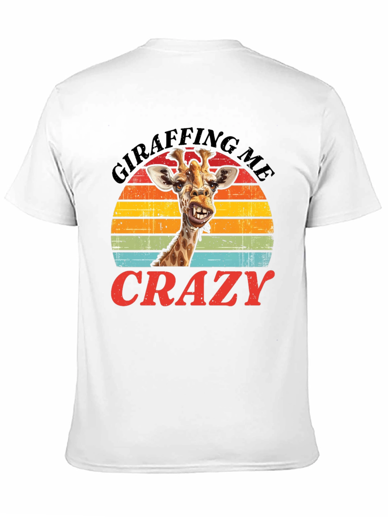 Luce esta original camiseta negra con un diseño llamativo de una jirafa que te hará sonreír. El estampado presenta una simpática jirafa con una expresión graciosa sobre un fondo de puesta de sol retro en tonos naranja, amarillo y azul. La frase "GIRAFFING ME CRAZY" añade un toque humorístico. Perfecta para los amantes de los animales y aquellos que buscan una prenda única y divertida para expresar su personalidad. Ideal para uso casual, salidas con amigos o para añadir un toque de alegría a tu día a día. ¡Consigue la tuya y marca la diferencia!