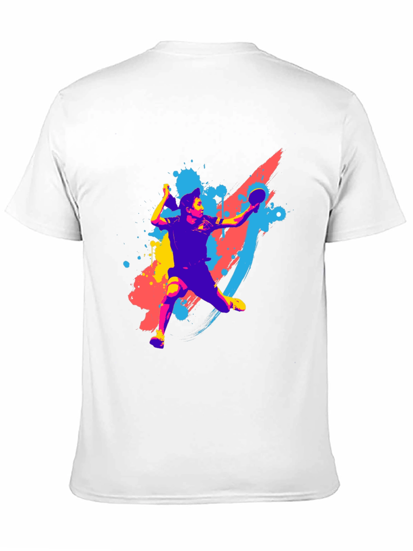 Luce un estilo único con esta camiseta negra de algodón. Presenta un diseño abstracto y colorido de un jugador de tenis de mesa en acción. Los vibrantes toques de color sobre el fondo oscuro crean un efecto visual llamativo y moderno. Perfecta para los amantes del deporte, el arte y la moda urbana. Ideal para usar en el gimnasio, salir con amigos o simplemente para expresar tu personalidad con un toque original. Su tejido suave y cómodo te mantendrá fresco y relajado durante todo el día. ¡Destaca entre la multitud con esta prenda única!