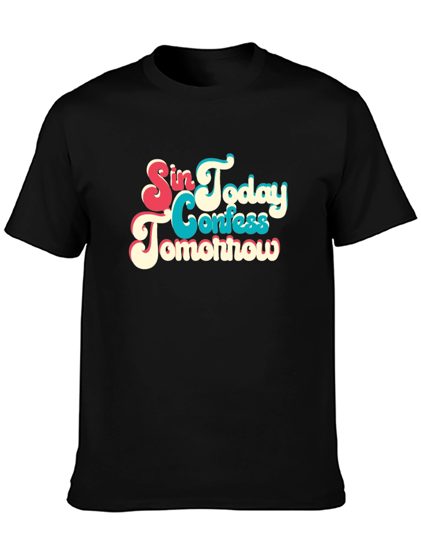 Luce un estilo desenfadado y con un toque de humor con esta llamativa camiseta negra. El diseño "Peca Hoy, Confiesa Mañana", en vibrantes colores retro como el rojo coral y el turquesa, destaca sobre el fondo oscuro, garantizando que no pases desapercibido. Fabricada en un suave tejido de algodón, esta camiseta de manga corta te ofrece comodidad y estilo durante todo el día. Perfecta para expresar tu personalidad en salidas casuales, reuniones con amigos o simplemente para relajarte en casa con un toque irreverente. ¡Atrévete a romper moldes con esta original prenda!