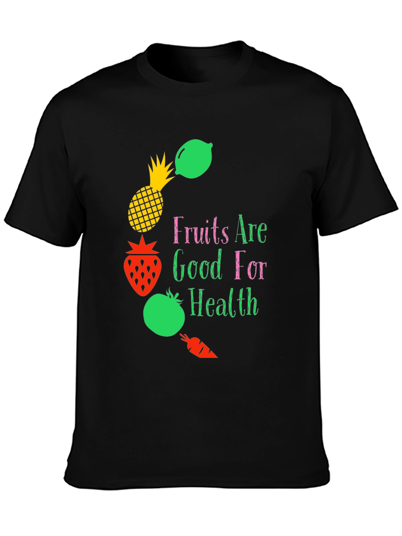 Luce un estilo saludable con esta camiseta negra de diseño único. Presenta una llamativa ilustración de frutas como piña, fresa, lima y zanahoria, acompañadas del mensaje "Fruits Are Good For Health". Confeccionada en tela suave y cómoda, esta camiseta es ideal para expresar tu interés por un estilo de vida sano y activo. Perfecta para usar en el gimnasio, en salidas informales o simplemente para añadir un toque original a tu vestuario diario. ¡Una prenda que combina moda y bienestar!