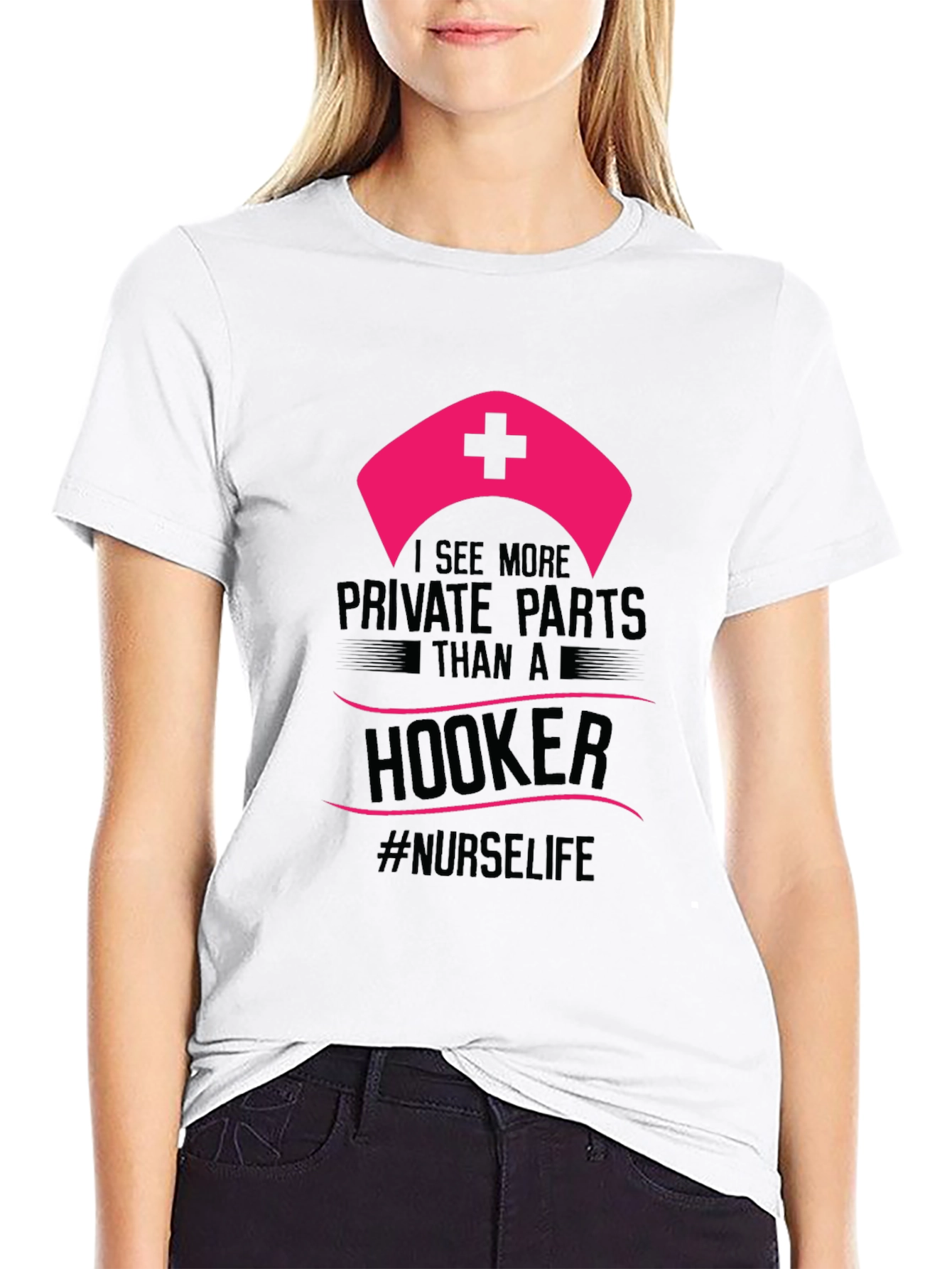 Muestra tu sentido del humor con esta llamativa camiseta negra. Presenta un diseño gráfico en tonos rosa y negro que incluye un gorro de enfermera estilizado con una cruz, y la divertida frase "I SEE MORE PRIVATE PARTS than a HOOKER #NURSELIFE". Fabricada con un tejido suave al tacto, probablemente algodón o una mezcla de algodón, esta camiseta de manga corta ofrece comodidad y estilo. Perfecta para llevar en el trabajo, fuera de él, o como un regalo original para cualquier enfermera con sentido del humor. Haz una declaración divertida y profesional con esta prenda única.