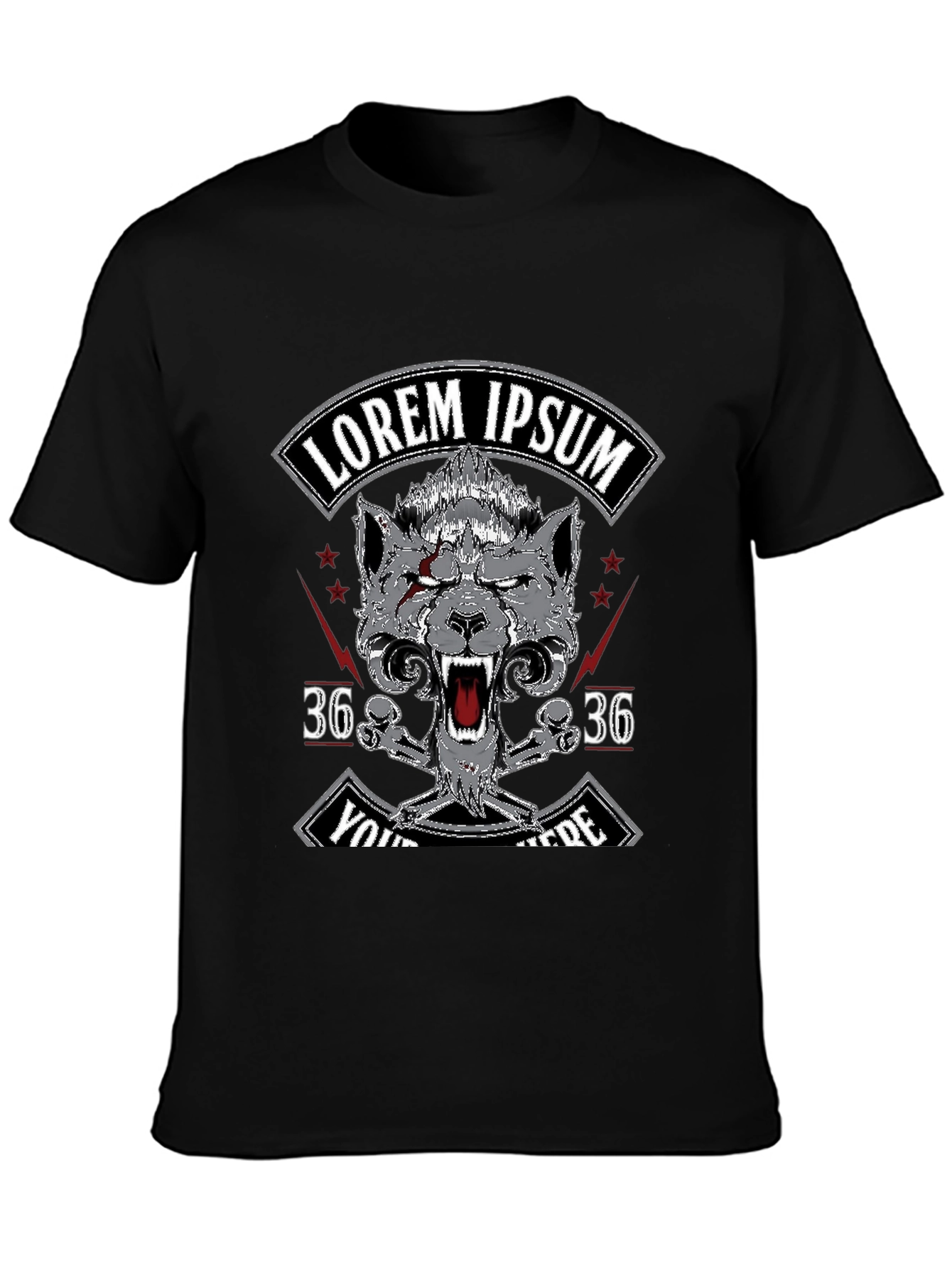 Luce un estilo audaz y único con esta camiseta negra de manga corta. Presenta un impactante diseño gráfico de un lobo feroz en tonos grises y detalles en rojo, enmarcado por texto personalizable en la parte superior e inferior. El diseño incluye elementos como rayos y huesos cruzados, agregando un toque rebelde. Ideal para quienes buscan expresar su individualidad con prendas originales y llamativas. Perfecta para uso casual, conciertos o eventos donde quieras destacar. ¡Personaliza tu estilo con esta camiseta de diseño exclusivo!