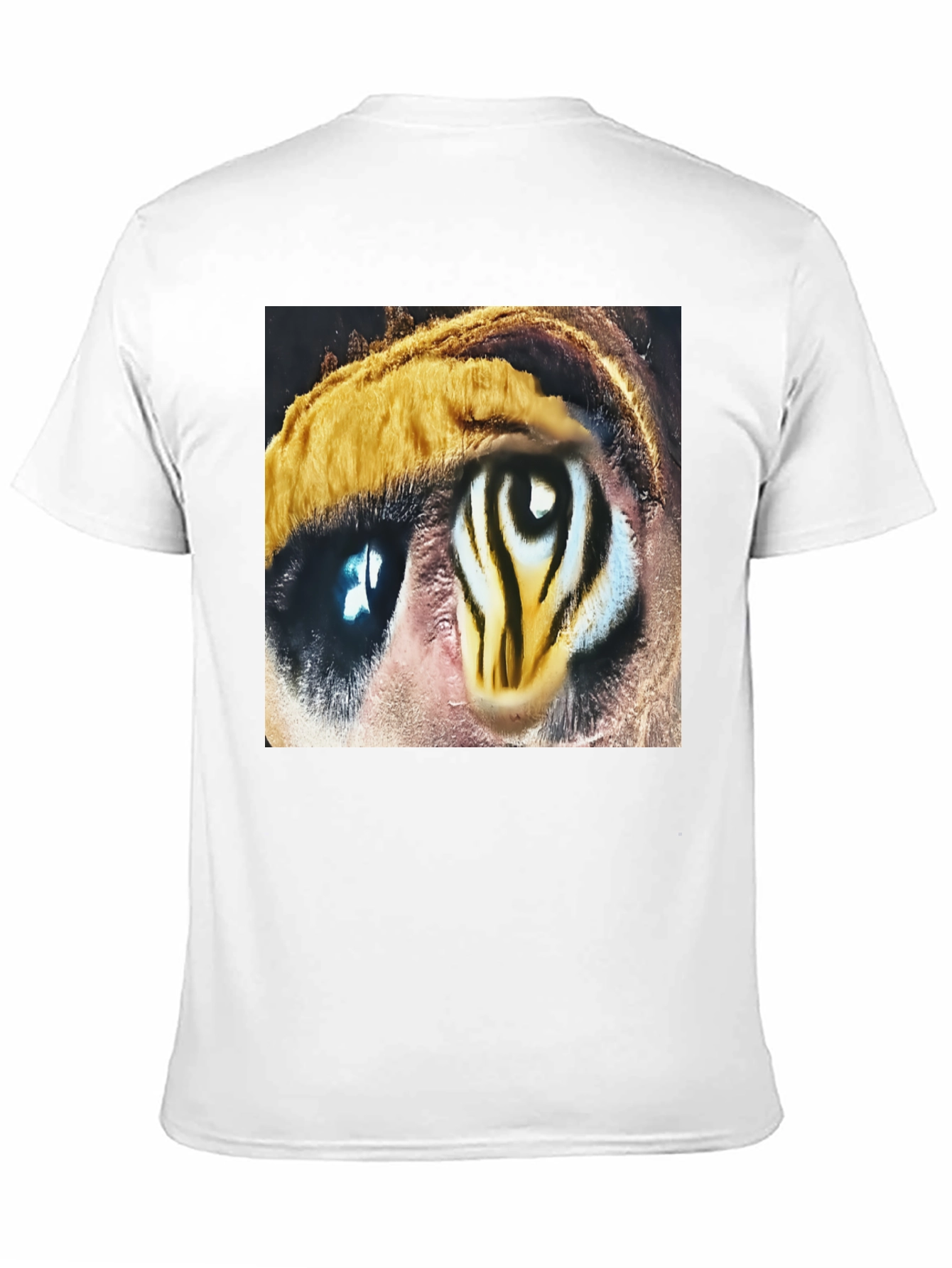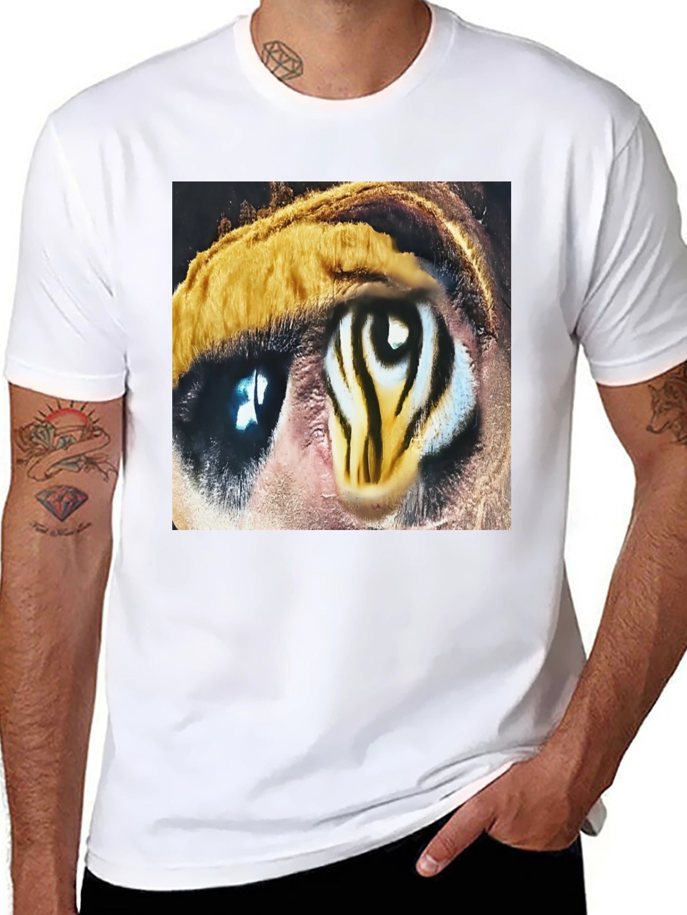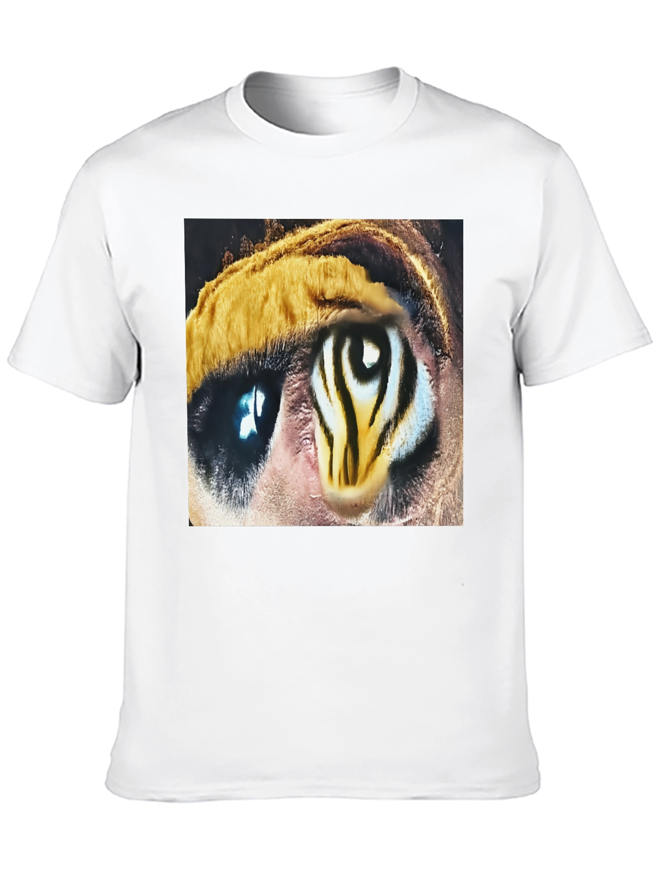 Luce un estilo audaz con esta camiseta negra de manga corta. Presenta un llamativo diseño abstracto de un ojo de tigre fusionado con rasgos humanos. La imagen, impresa con alta calidad, destaca por su intrincada combinación de colores y texturas, creando un efecto visual impactante. Ideal para aquellos que buscan expresar su individualidad y un gusto por lo artístico. Perfecta para llevar en eventos casuales, conciertos o simplemente para destacar en el día a día. Confeccionada con un material suave y cómodo, esta camiseta ofrece un ajuste relajado y favorecedor. ¡Atrévete a marcar la diferencia con esta prenda única y original!