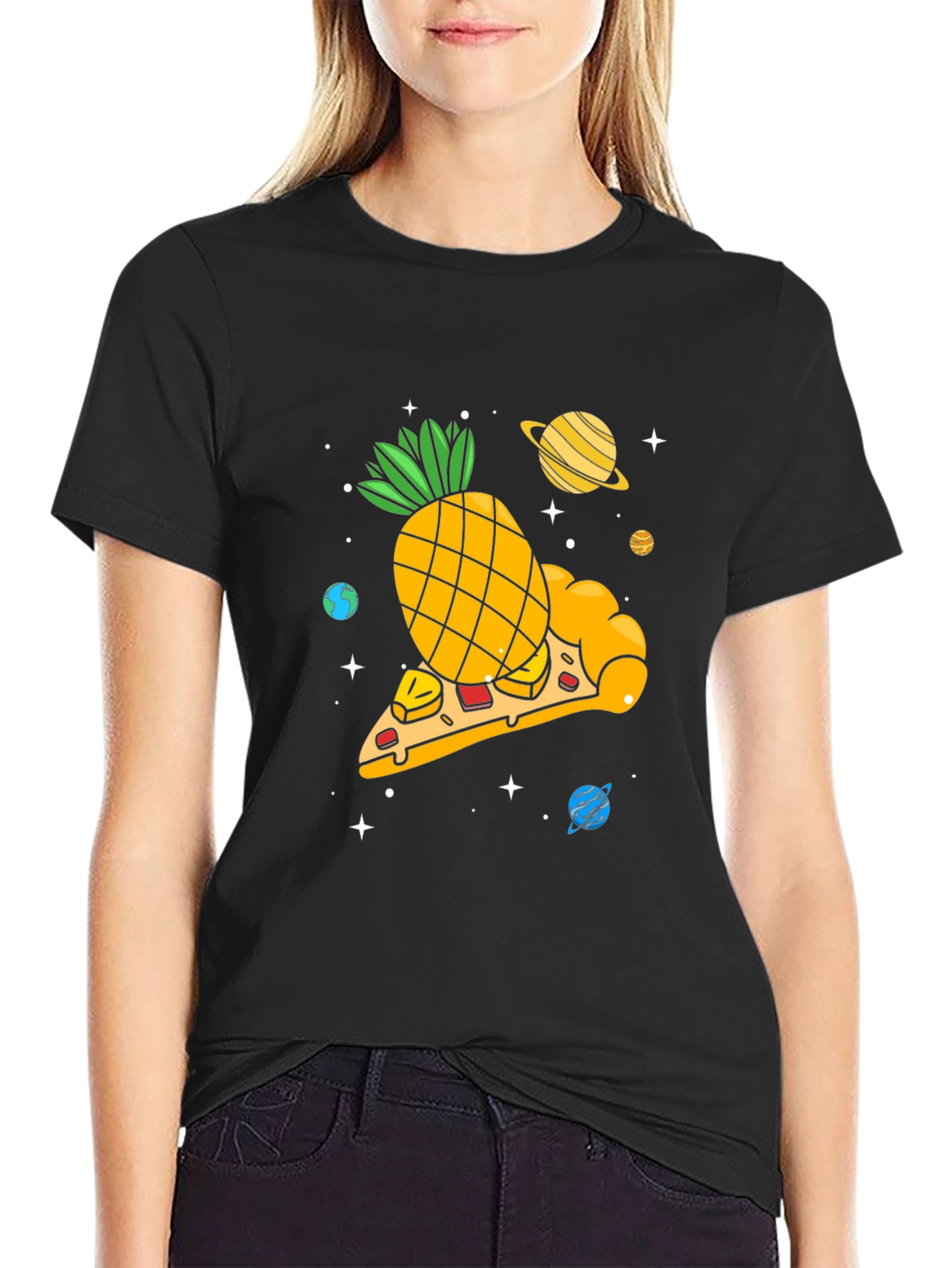 Luce esta llamativa camiseta negra con un diseño único y divertido. Presenta una ilustración de una porción de pizza espacial con una piña en lugar de ingredientes tradicionales, rodeada de planetas y estrellas. Ideal para aquellos que aman la pizza con piña y el espacio exterior. Fabricada con materiales suaves y cómodos, esta camiseta es perfecta para uso diario, destacar en eventos informales o como un regalo original para amigos y familiares con gustos excéntricos. ¡Atrévete a llevar este diseño audaz y muestra tu personalidad única!