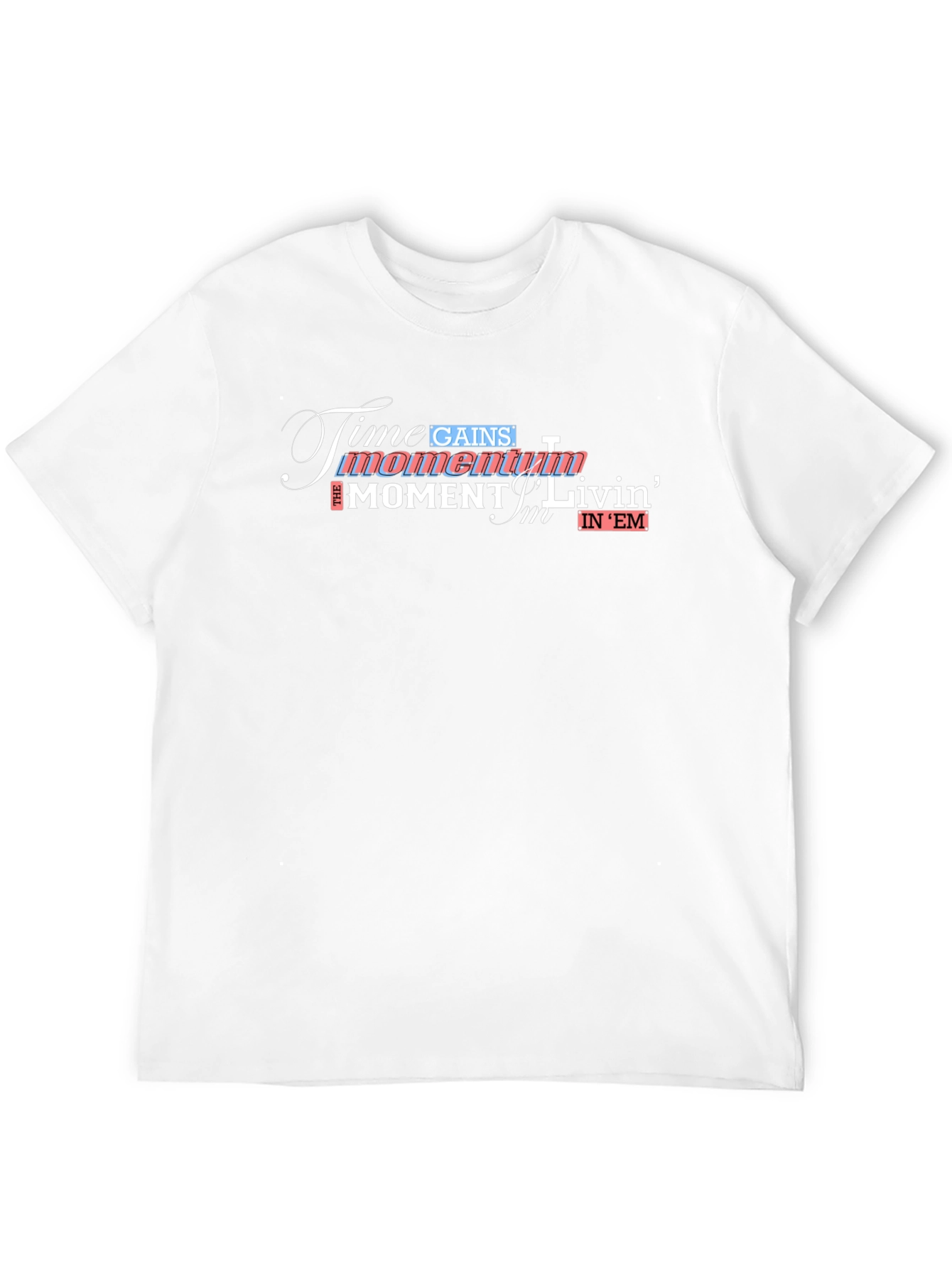 Destaca con esta moderna camiseta negra de manga corta. Presenta un atractivo diseño estampado con la frase "Time Gains momentum, Livin' in the moment, in 'em", fusionando estilo y actitud. Ideal para un look casual y relajado, esta camiseta es perfecta para expresar tu individualidad con un toque único. El color negro clásico garantiza versatilidad, combinando fácilmente con cualquier atuendo. Perfecta para el uso diario, actividades al aire libre o simplemente relajarte con estilo.