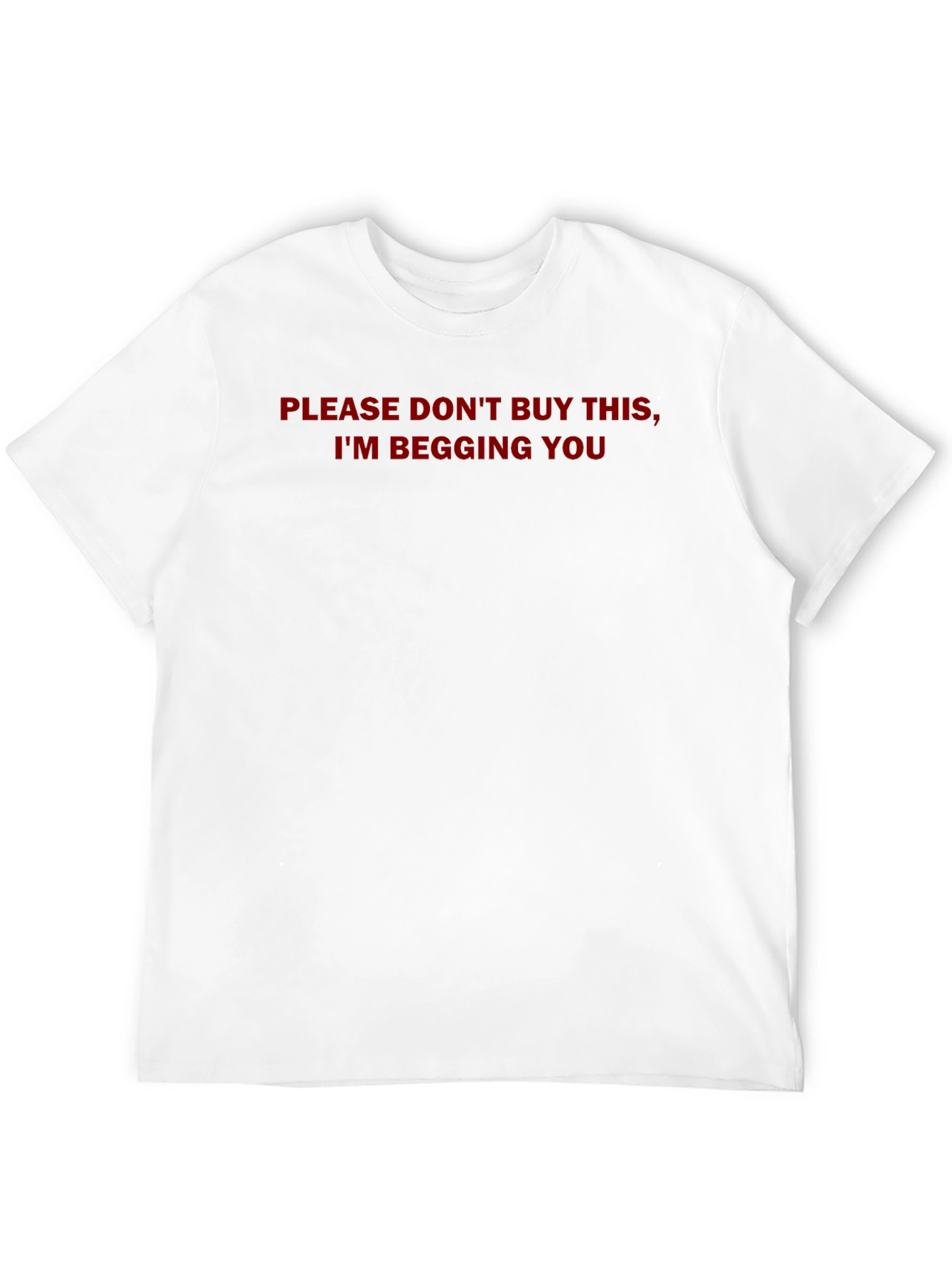 Esta camiseta negra de manga corta presenta un texto llamativo en color rojo que dice: "PLEASE DON'T BUY THIS, I'M BEGGING YOU". El diseño sencillo pero impactante la convierte en una prenda ideal para aquellos que buscan un toque de humor y originalidad en su vestuario. Fabricada con materiales que parecen suaves y cómodos, es perfecta para usar en salidas informales, reuniones con amigos o simplemente para relajarse en casa con estilo. Muestra tu lado divertido y despreocupado con esta camiseta que seguro llamará la atención y generará sonrisas.