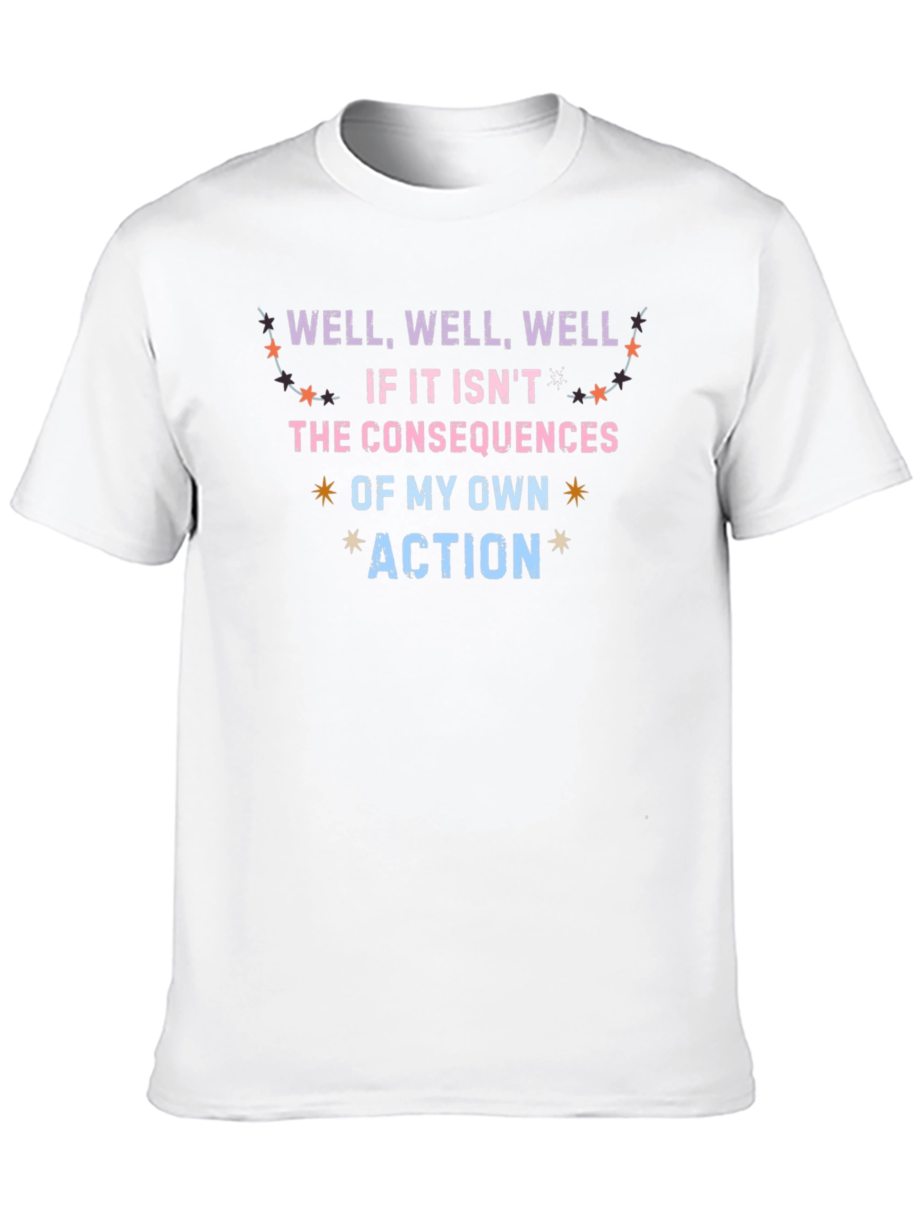 Luce esta camiseta negra de manga corta con un diseño divertido y sarcástico. En ella se lee la frase "Bueno, bueno, bueno, si no son las consecuencias de mis propias acciones" en una tipografía moderna con detalles de estrellas que le dan un toque original. Ideal para expresar tu sentido del humor y tu personalidad en cualquier ocasión informal. Perfecta para combinar con jeans, pantalones cortos o faldas. Esta prenda es cómoda y está hecha para durar. ¡Demuestra tu actitud con estilo!