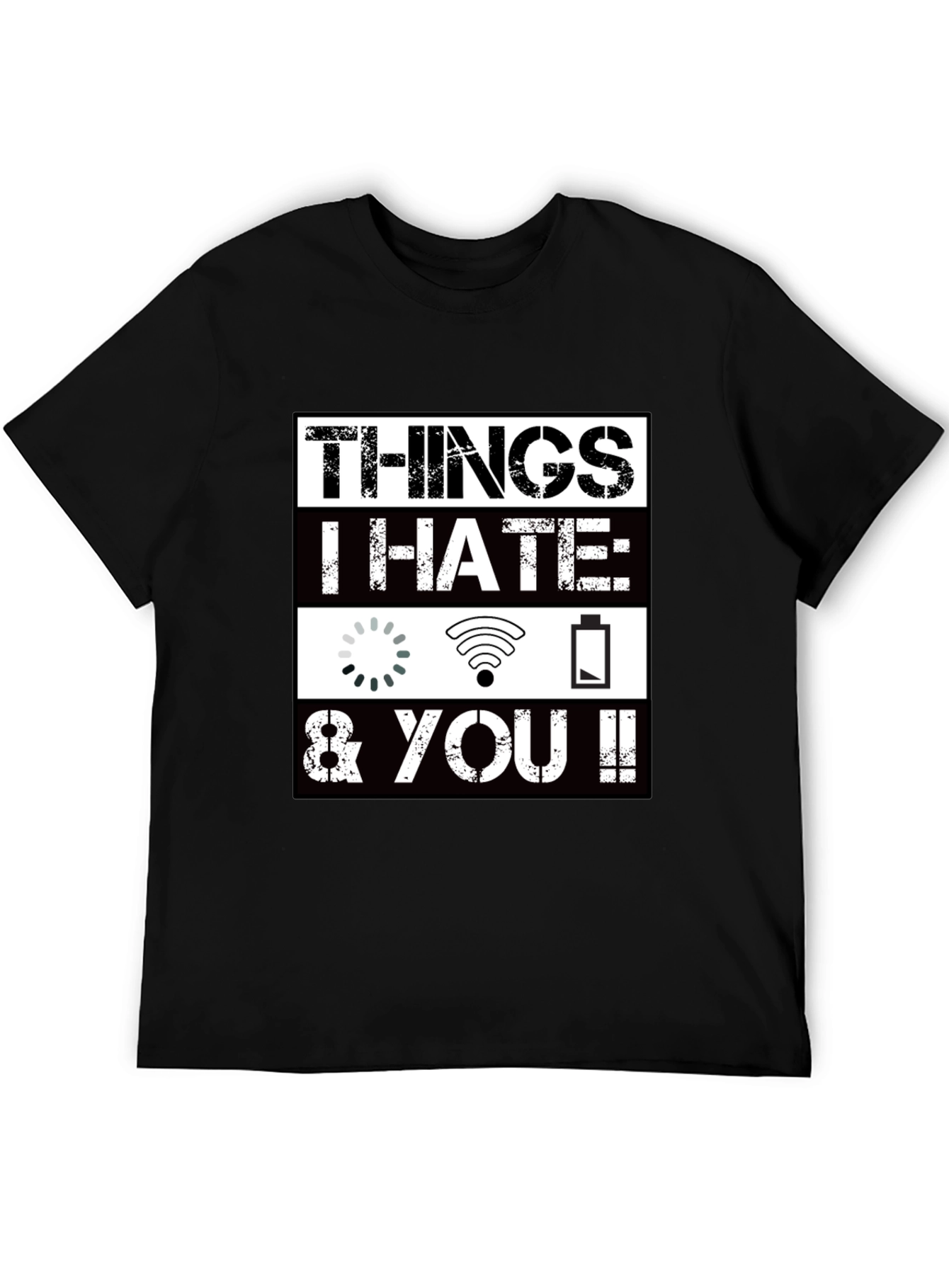 Luce tu sentido del humor con esta camiseta negra de algodón. Presenta un diseño divertido y llamativo con la frase "THINGS I HATE:" (Cosas que odio:) seguida de iconos que representan un círculo de carga, una señal wifi y una batería baja, culminando con un provocador "& YOU!!" (¡¡Y TÚ!!). Ideal para los amantes de la tecnología con un toque de ironía. Perfecta para el uso diario, reuniones informales o para regalar a ese amigo/a que siempre se queja del internet. Destaca con esta prenda única y expresa tu personalidad de manera original y divertida.