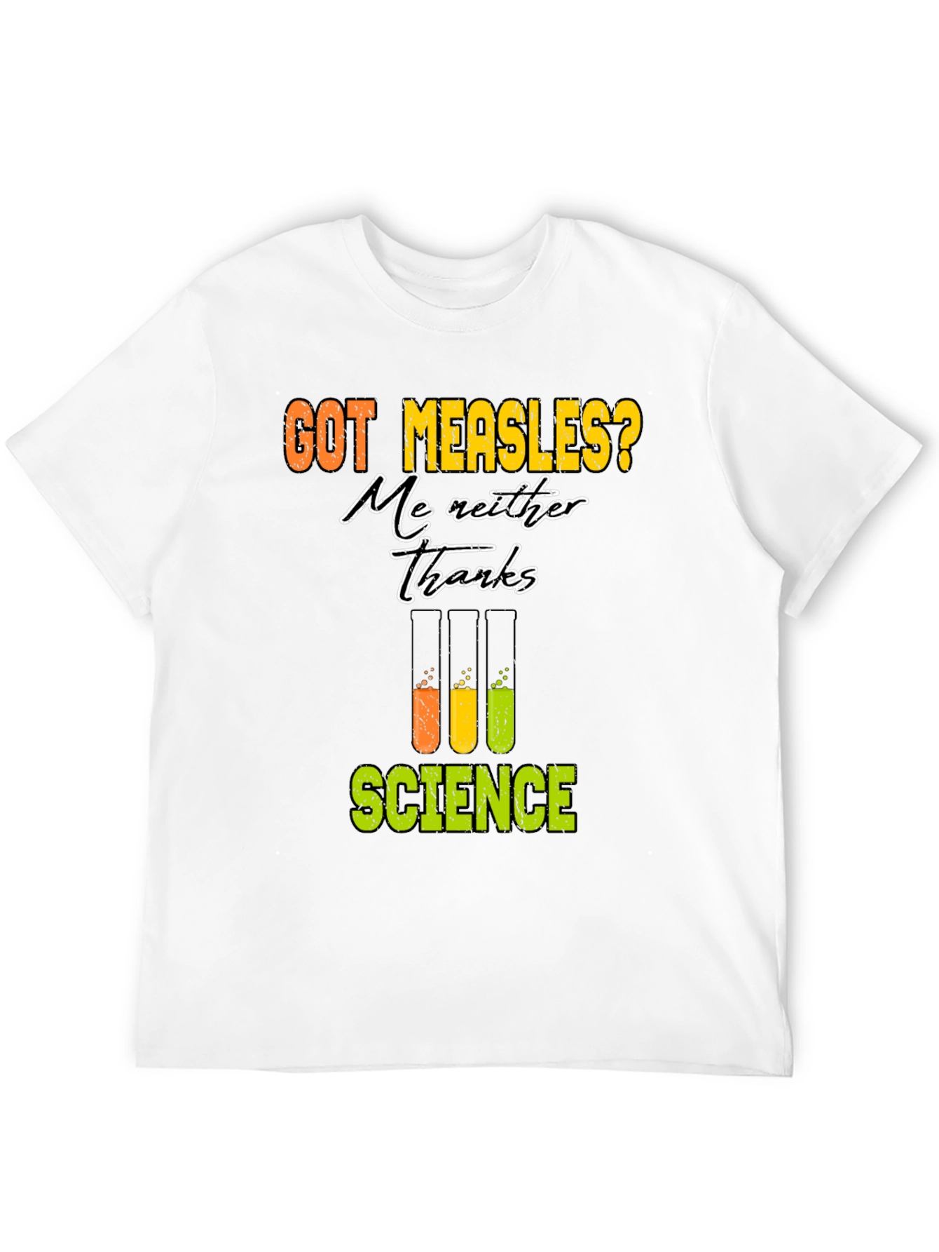 Muestra tu amor por la ciencia con esta divertida camiseta negra. El diseño presenta la frase "¿Got Measles? Me neither Thanks" (¿Tienes sarampión? Yo tampoco, gracias) con un diseño creativo de tres tubos de ensayo llenos de líquidos de diferentes colores, resaltando la palabra "SCIENCE" (Ciencia) en la parte inferior. Perfecta para científicos, estudiantes o cualquier persona que valore la salud y la inmunización. Ideal para usar en el laboratorio, clases o simplemente para expresar tu opinión con estilo. ¡Un regalo original y llamativo para tus amigos y familiares con mentalidad científica!