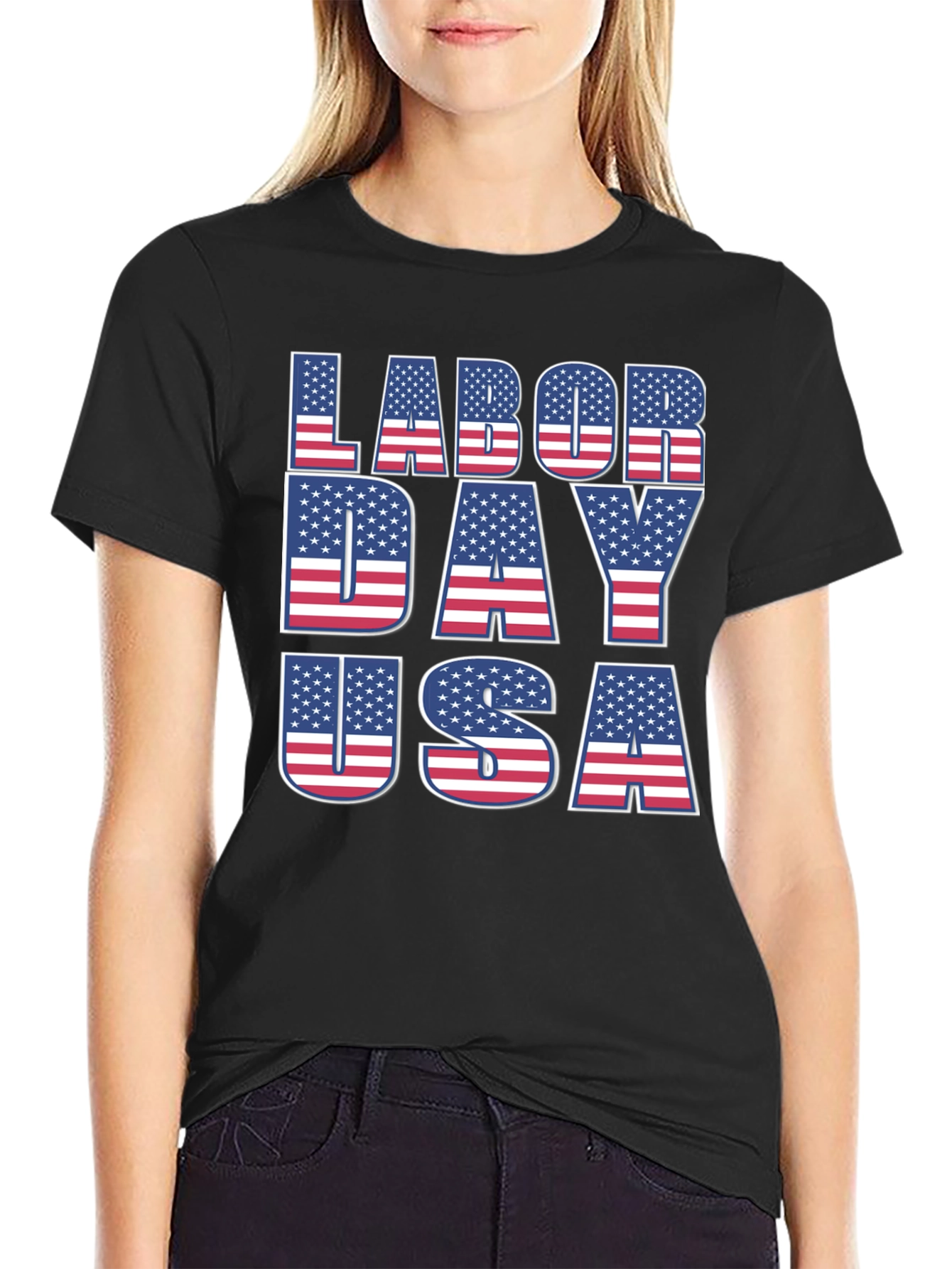 Celebra el Día del Trabajo con estilo con esta camiseta negra patriótica. El diseño presenta las palabras "LABOR DAY USA" rellenas con la bandera de los Estados Unidos, mostrando estrellas y rayas en un esquema de color rojo, blanco y azul. Perfecta para cualquier celebración patriótica, barbacoa o simplemente para mostrar tu orgullo americano. El color negro de la camiseta proporciona un fondo nítido que hace que el diseño patriótico destaque. Está hecha de un material cómodo y transpirable, ideal para usar todo el día mientras celebras el Día del Trabajo. Muestra tu espíritu patriótico y celebra con estilo con esta camiseta única y llamativa.