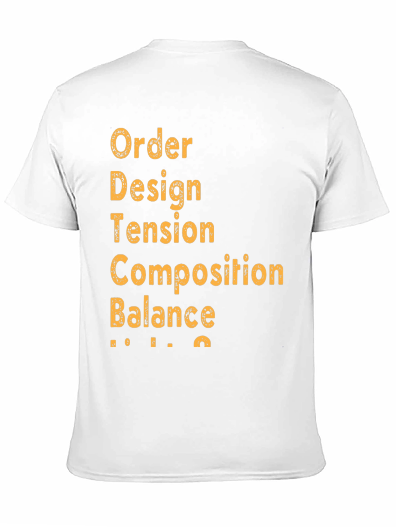 Luce una camiseta negra con un diseño artístico único. La camiseta presenta las palabras "Orden, Diseño, Tensión, Composición, Balance" impresas en color amarillo, creando un contraste llamativo y moderno. Fabricada con materiales de alta calidad, esta camiseta ofrece comodidad y durabilidad. Perfecta para expresar tu pasión por el diseño y el arte. Ideal para uso diario, eventos creativos o como un regalo original para amantes del diseño. Combina estilo y significado con esta prenda exclusiva.