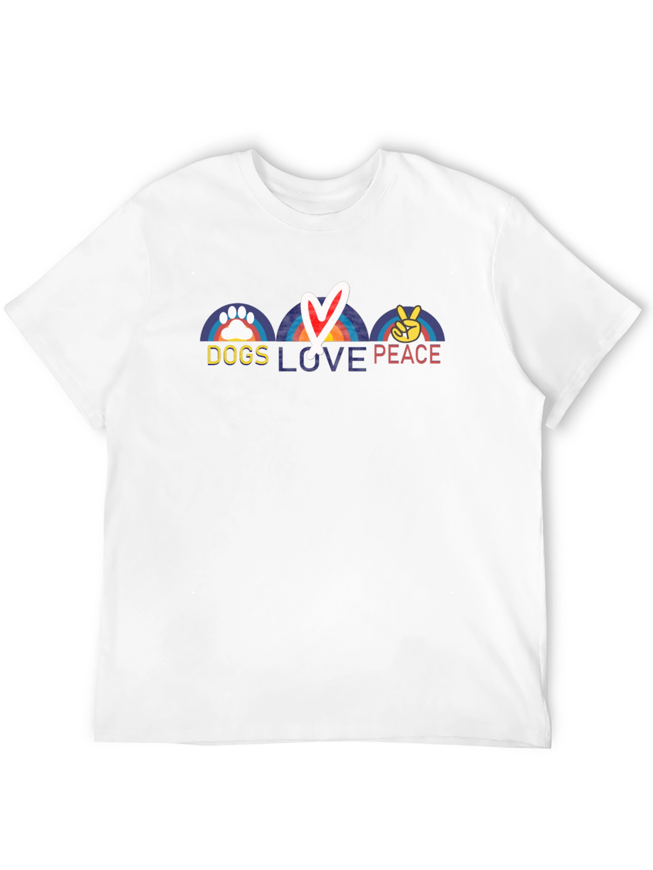 Muestra tu amor por los perros y la paz con esta camiseta negra de diseño único. Presenta un llamativo gráfico con una huella de pata, un corazón y el símbolo de la paz, todos enmarcados con un arcoíris colorido. La frase "DOGS LOVE PEACE" debajo complementa el diseño, creando un mensaje positivo y encantador. Hecha de un material suave y cómodo, esta camiseta es perfecta para el uso diario. Ideal para paseos con tu mascota, reuniones casuales o simplemente para expresar tu personalidad amante de los animales. ¡Luce con orgullo esta prenda llena de buena onda y estilo!