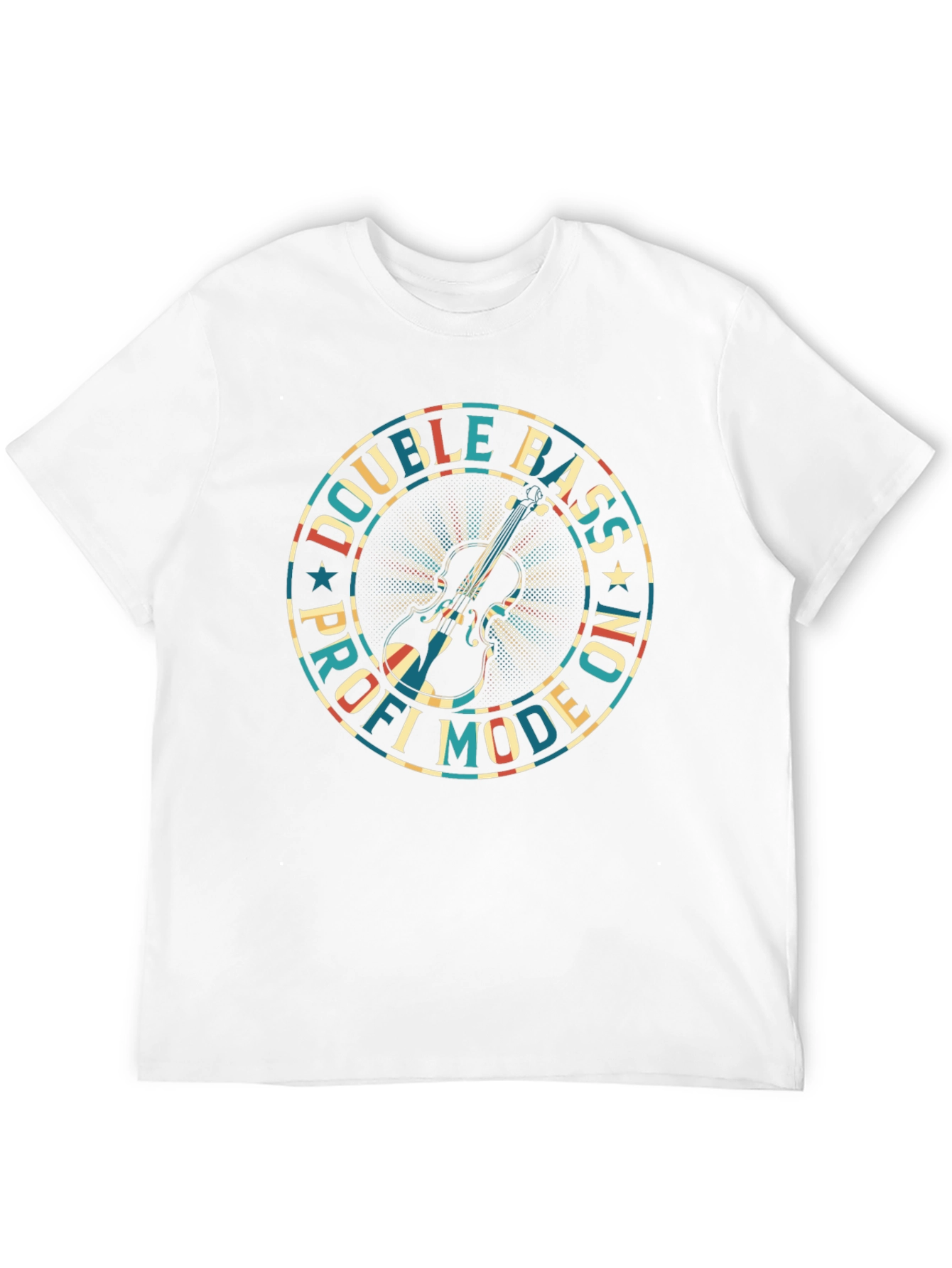 Luce tu pasión por la música con esta camiseta negra de manga corta. El diseño presenta un llamativo gráfico circular con la inscripción "Double Bass Profi Mode On" rodeando la imagen de un contrabajo estilizado. Los colores vintage azul, rojo y crema del diseño le dan un toque retro y atractivo. Fabricada en un material suave y cómodo, esta camiseta es perfecta para músicos, amantes del jazz y cualquier persona que aprecie un estilo único. Ideal para uso diario, conciertos o como un regalo original para ese amigo músico.