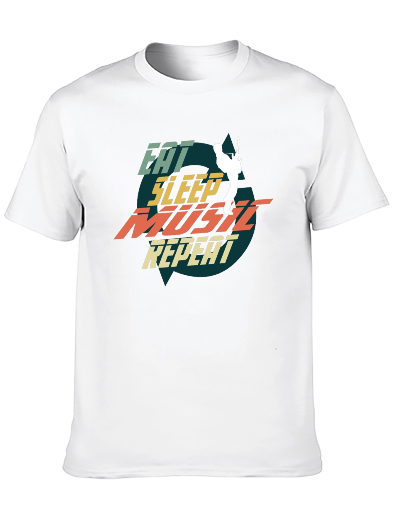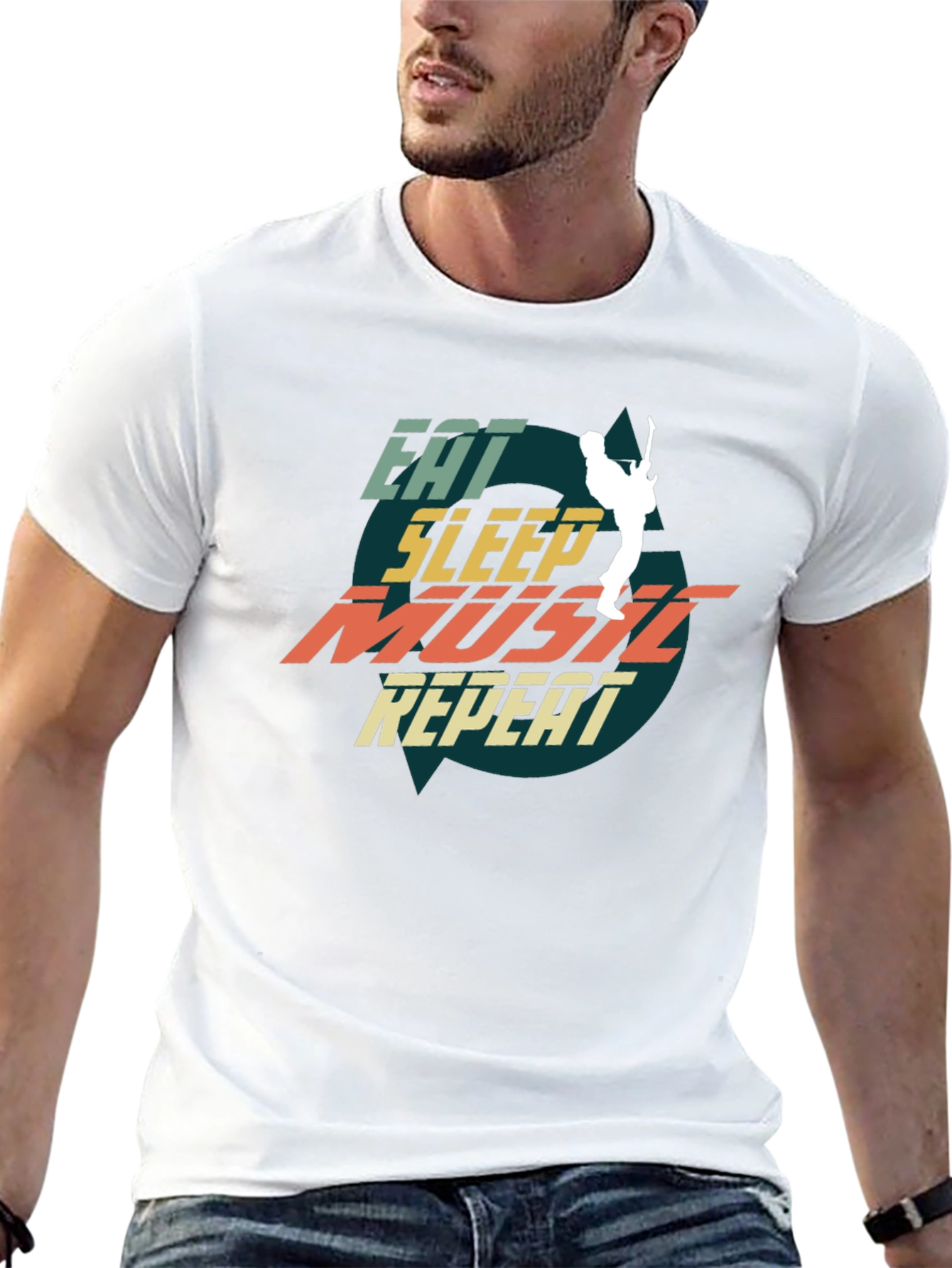 Luce tu pasión por la música con esta camiseta negra de diseño moderno. Presenta un llamativo gráfico que dice "Eat Sleep Music Repeat" en vibrantes colores retro. Una silueta blanca de un músico tocando la guitarra añade un toque artístico. Fabricada en un tejido suave y cómodo, esta camiseta de manga corta es perfecta para el uso diario, conciertos o simplemente para expresar tu amor por la música. Ideal para músicos y amantes de la música que buscan un estilo único y original. Combínala con jeans o pantalones casuales para un look relajado y con estilo.