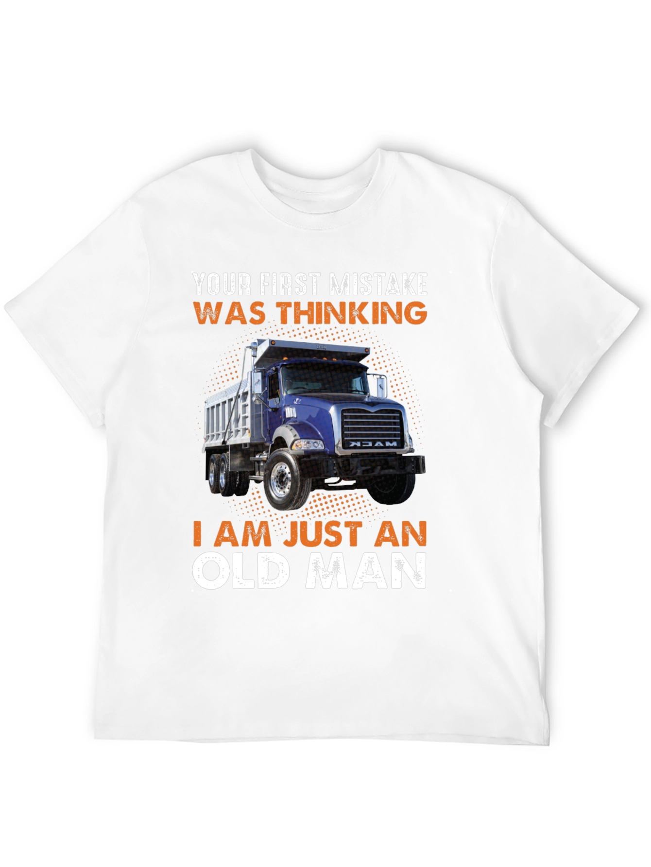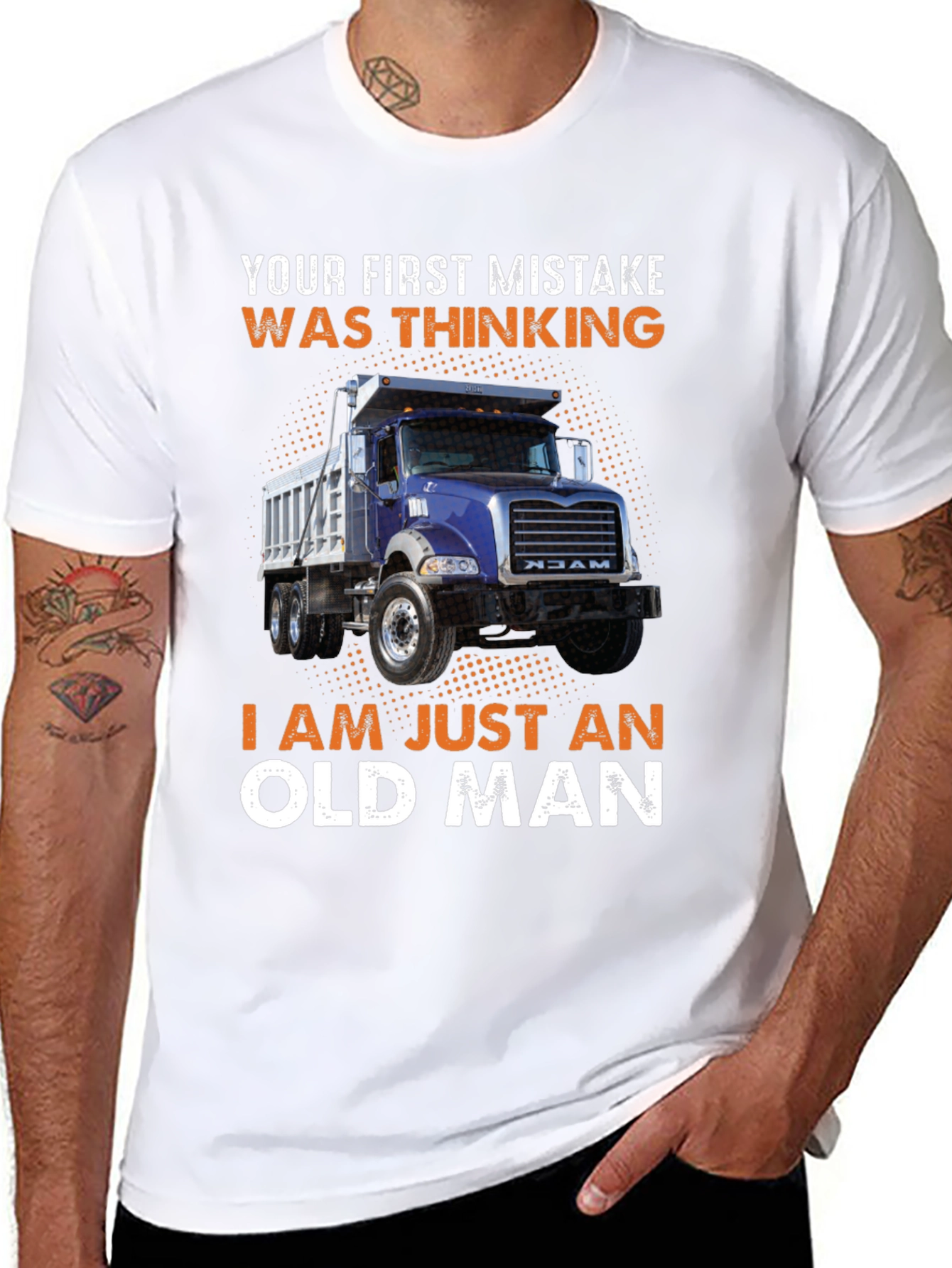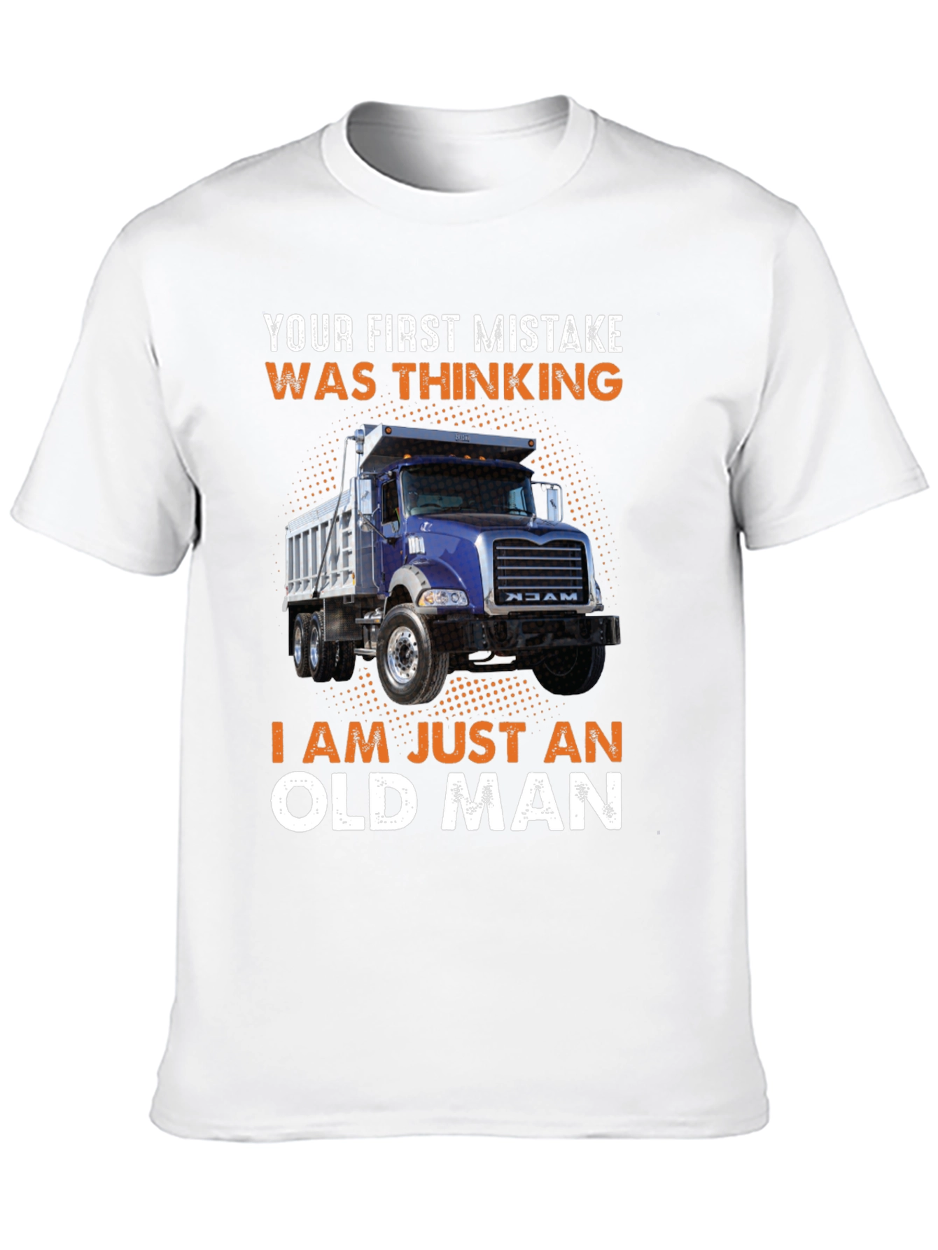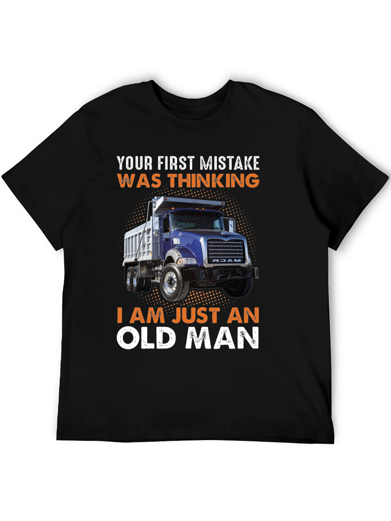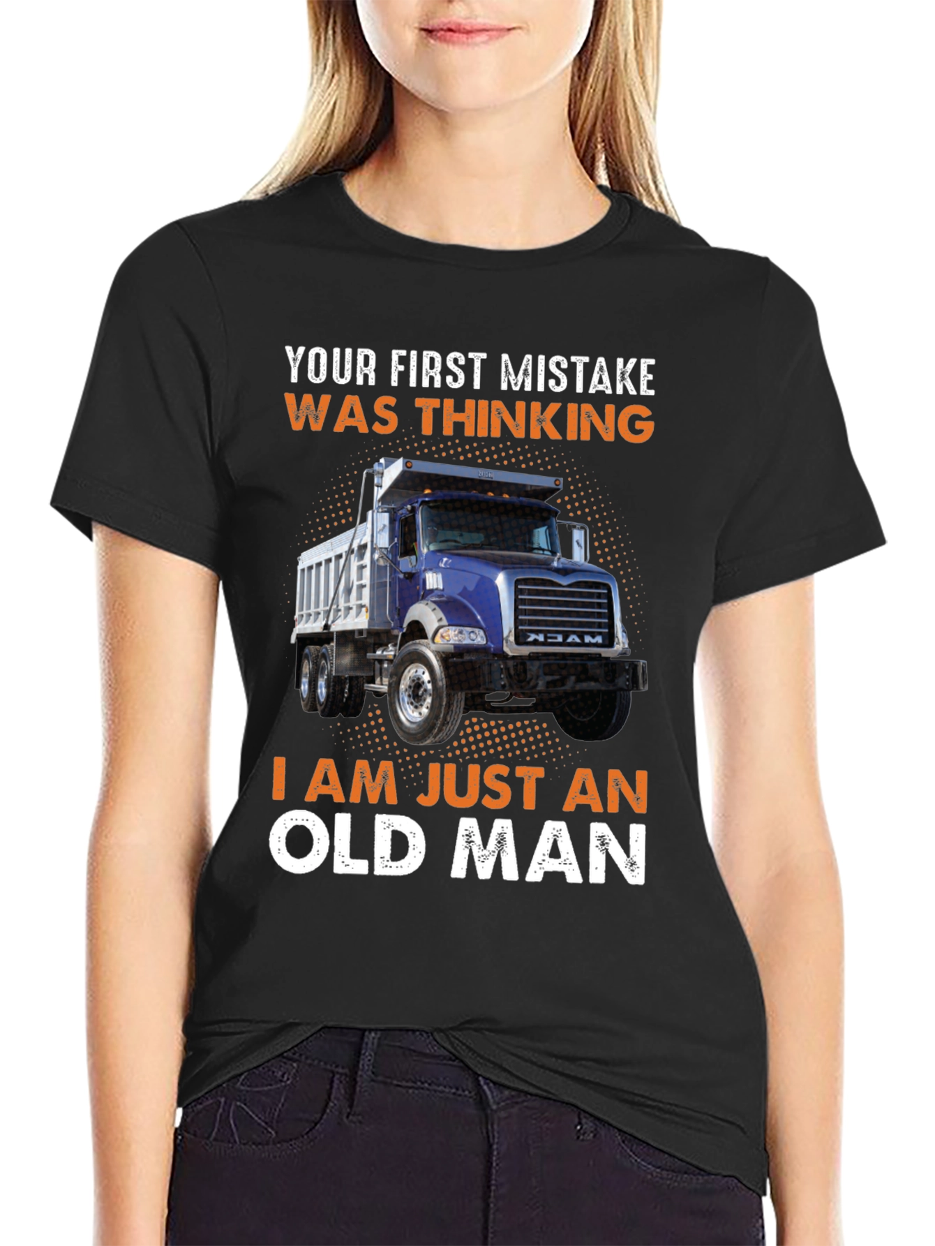 Esta llamativa camiseta negra presenta un diseño audaz y distintivo. En el centro, se aprecia un camión de volteo azul detallado, rodeado por la frase "YOUR FIRST MISTAKE WAS THINKING" en letras naranjas, y "I AM JUST AN OLD MAN" en blanco. La combinación de colores vibrantes y el diseño del camión le dan un toque masculino y robusto. Fabricada con un tejido suave y cómodo, esta camiseta es ideal para usar en el día a día, ya sea para trabajar al aire libre o para lucir un estilo casual y relajado. Su mensaje ingenioso y su diseño único la convierten en una excelente opción para aquellos que buscan expresar su personalidad con originalidad y actitud. Perfecta para regalar a amantes de los camiones o a cualquier persona con sentido del humor.